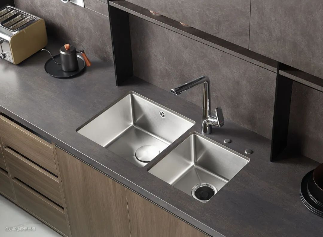 水槽推荐使用台下盆,相比于传统的台上盆,台下盆不仅外形更加精致,而且实用性也更强,当水槽周边残留积水时,用手一扫就能实现精准入盆。