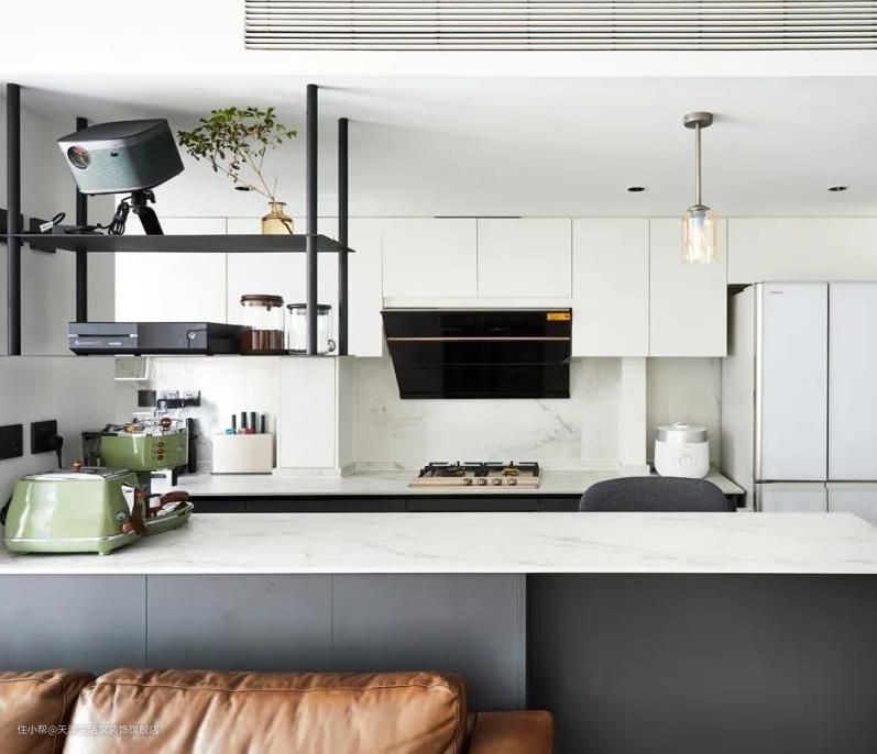 厨房水槽区和灶台区做高低台面设计,高差15cm左右,这样会更符合人体工学,不用弯腰弓背,有利于健康。