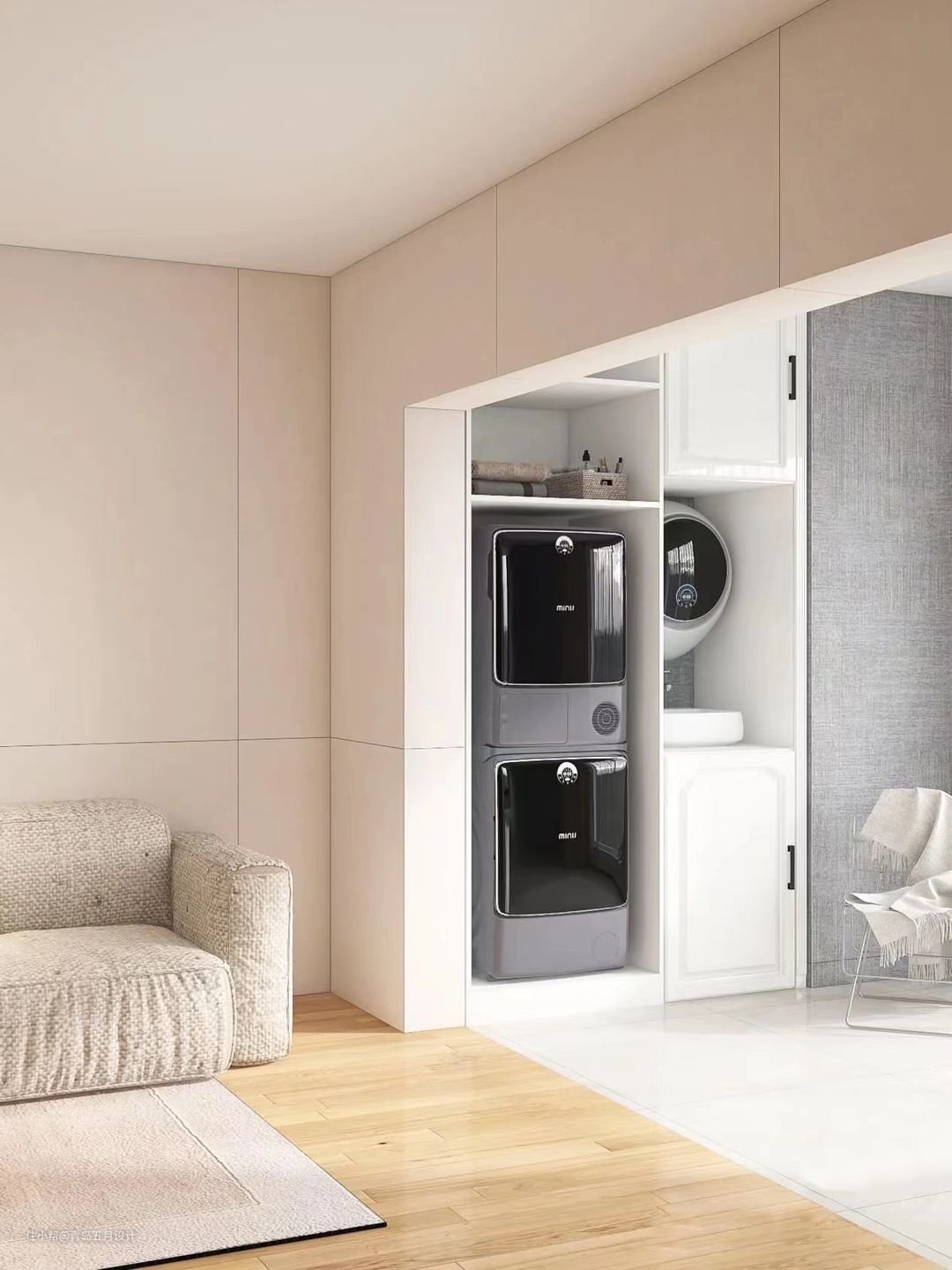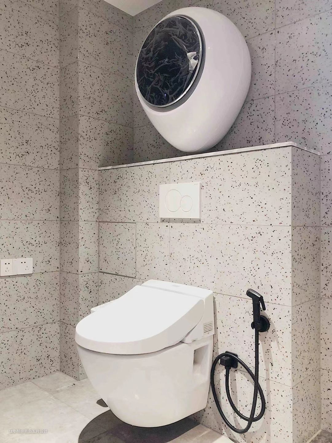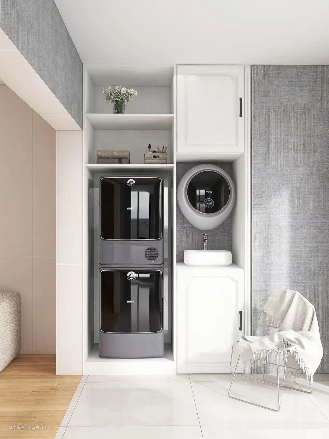 3、想要安装完的墙面只有壁挂洗衣机,负责任的设计师会与水电师傅、木作方沟通好水电预留位置,不然走明线颜值就会大打折扣呀!