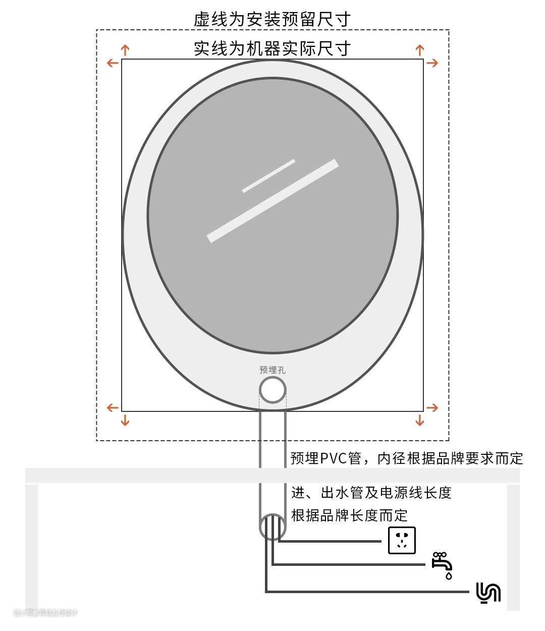 ▲上图为壁挂洗衣机安装的基本逻辑图示,具体尺寸及预留水电位置应根据选择的品牌型号来定。