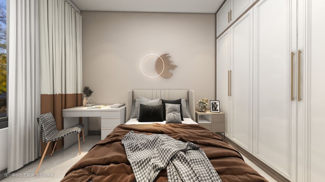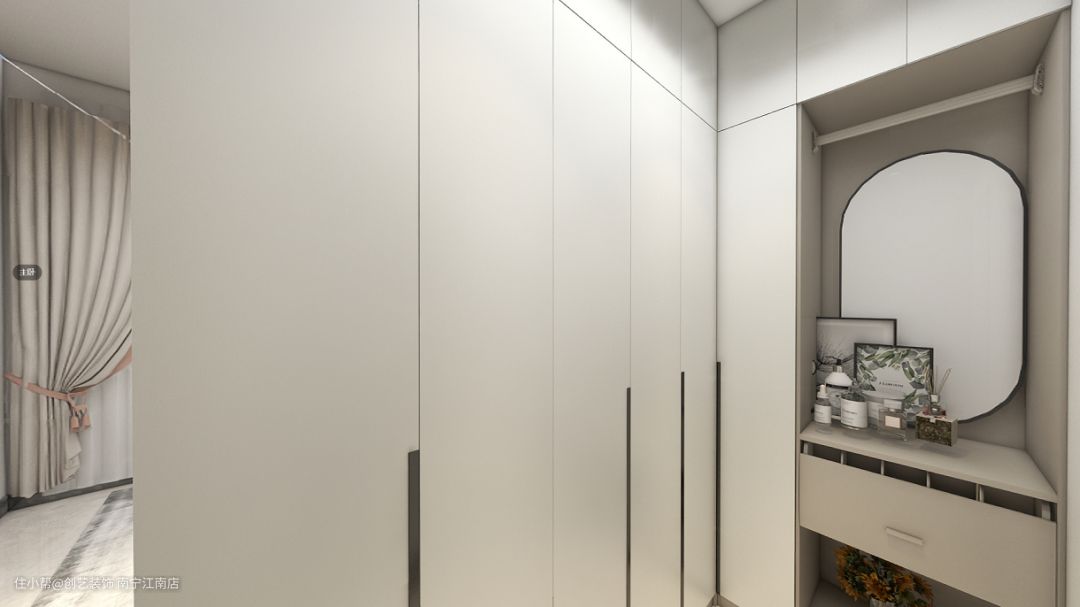 次卧室,白色衣柜、床头柜、床、梳妆台一字排开,功能齐全。色调是温暖的浅色调,温柔又舒适~
