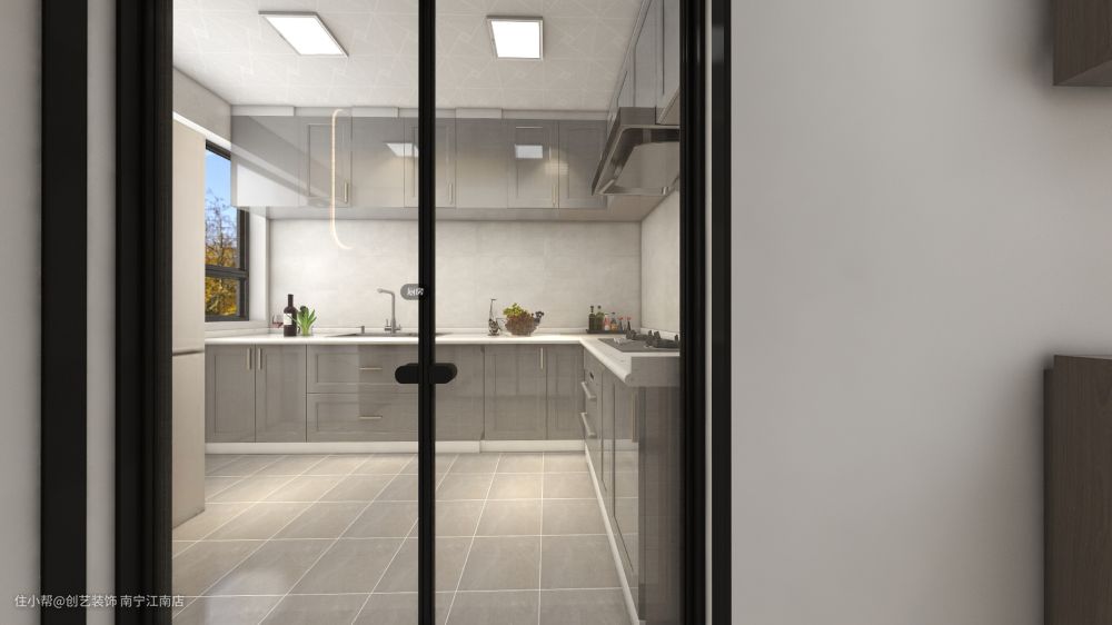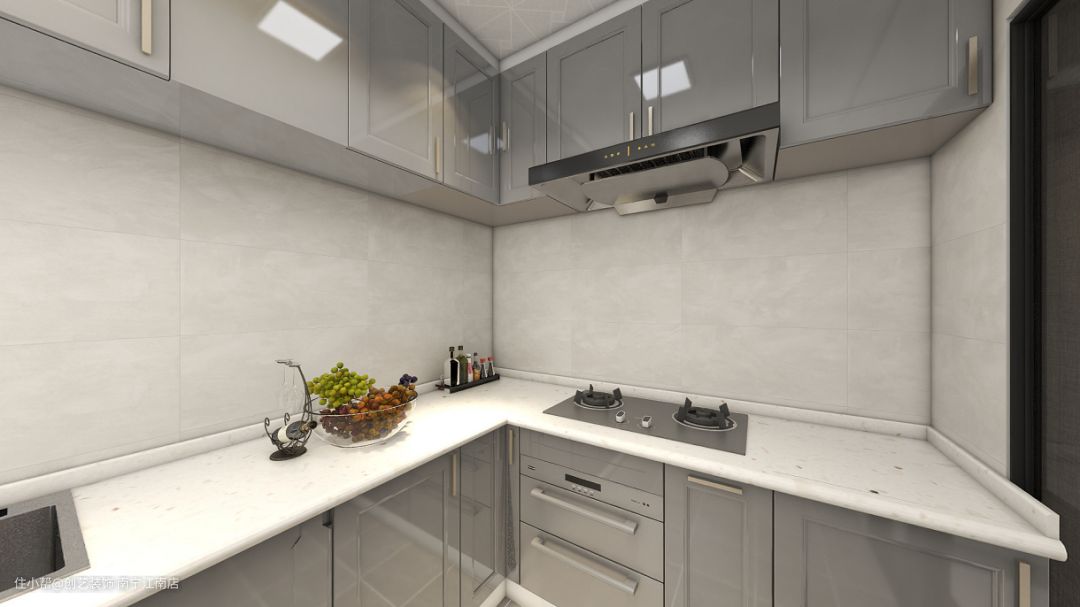 "U"字形状橱柜用一扇玻璃门与外界进行隔断,以白色石英石台面子午灰柜面铺展开来。