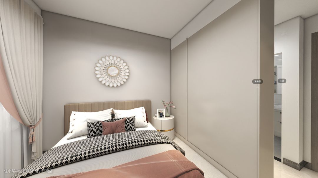 卧室延续主空间的调性氛围,将简约高级的质感呈现,为了增添卧室温馨的气氛。