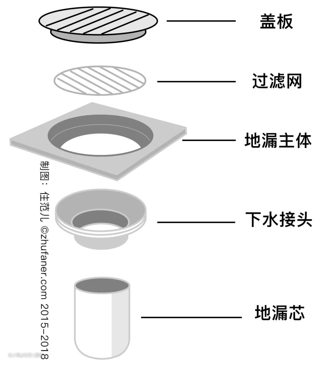 我们把地漏拆开来,通常有以下几部分: