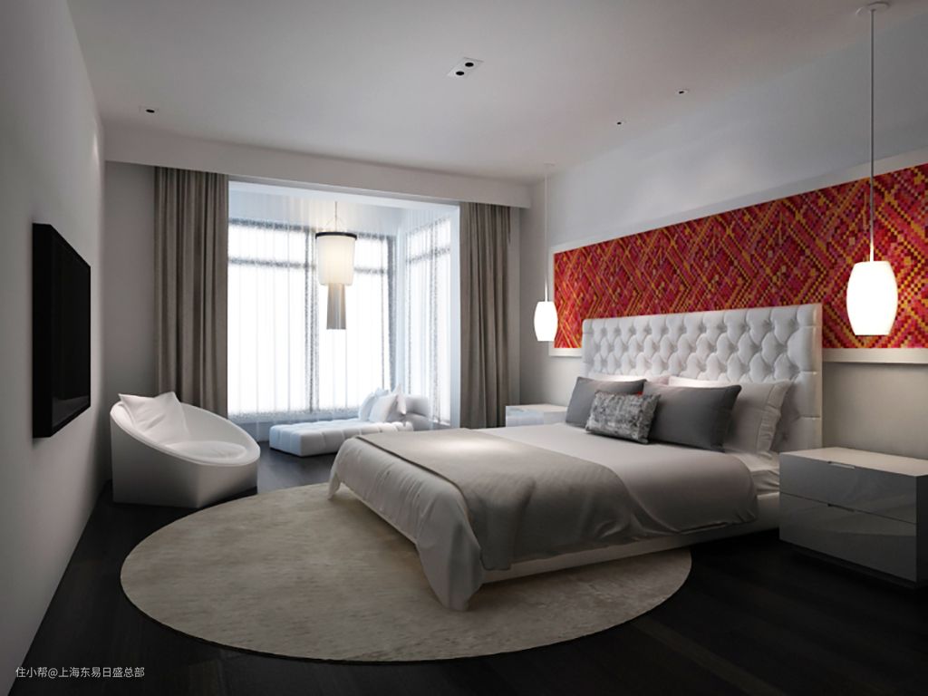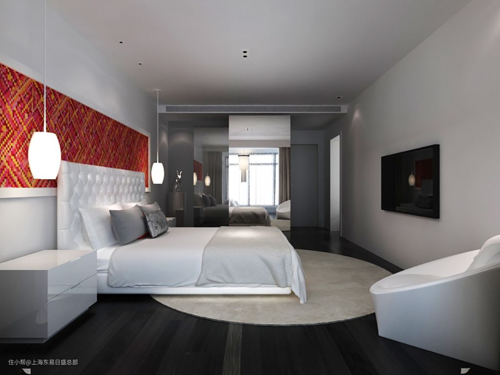 主卧延续了客厅浅灰色的基调,素雅大气,床头背景墙添加红色的装饰画作为提亮,让空间不至于过分低沉。白色的皮质双人床、舒适的床头靠背以及柔和的光线环境,营造舒适无压的睡眠环境。