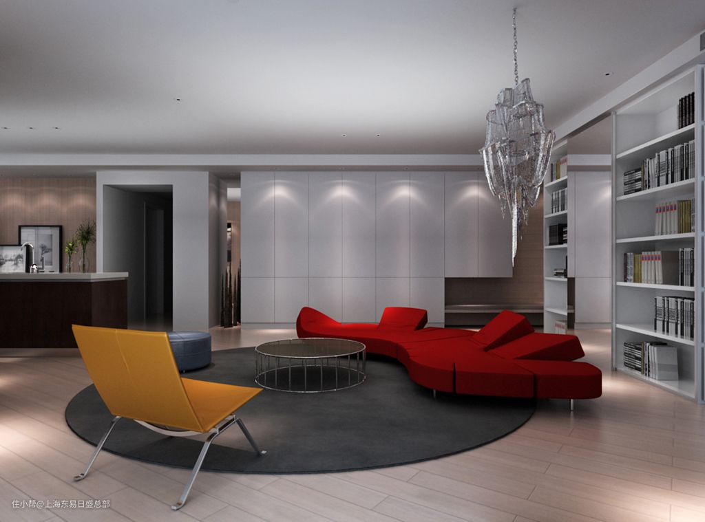 红色不规则沙发、蓝色沙发凳、橙色单椅,多种颜色与材质的搭配,让整个空间更具活力与时尚感。侧墙空间完全利用起来,一部分做隐藏式橱柜,另一侧做开放书柜,平时两位业主可以在此看书喝茶,度过自己的休闲时光。