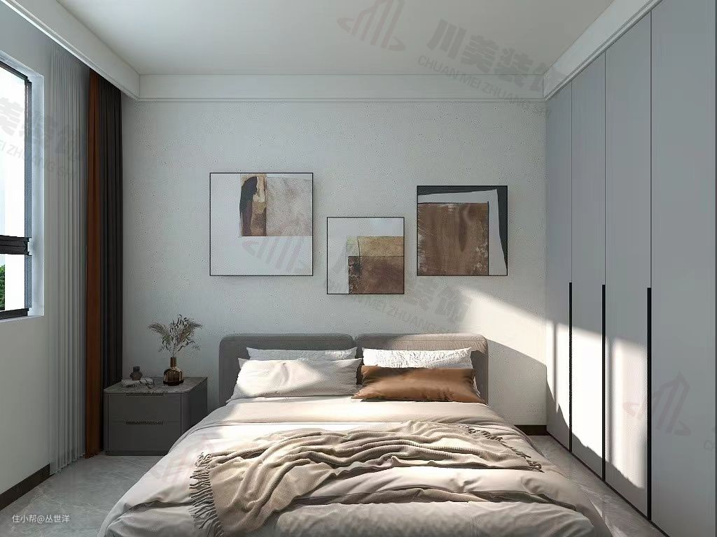 卧室柜体与客厅柜体颜色相互呼应,同时也增加了收纳空间,墙画更是增添了几分意境,温馨惬意。