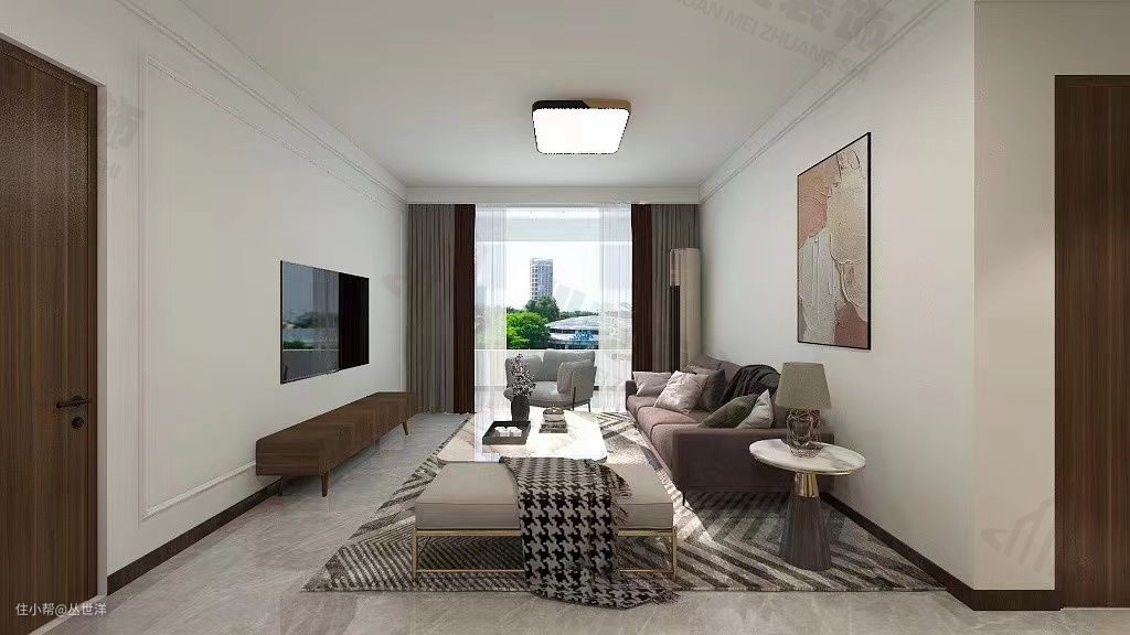 此户型为两室一厅一厨一卫,整体设计以白色和咖色为主色调,沉稳而温馨。