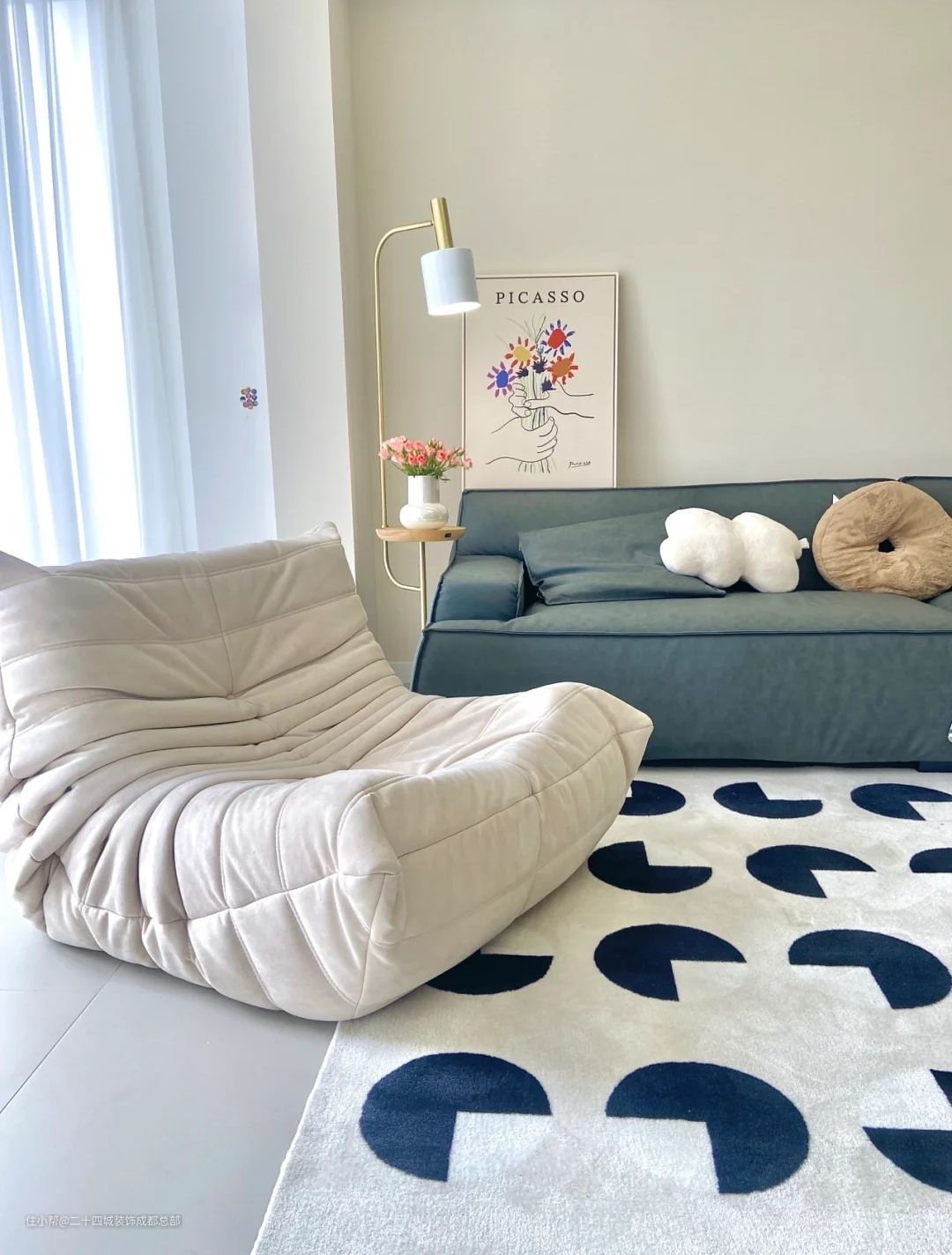 一旁搭配了毛毛虫沙发,多条褶皱构成的慵懒光是看到就让人非常放松,它慵懒贴肤,全泡棉,没有棱角和过多造型的形态,形态独特、坐感舒适,感觉整个人被沙发包裹,安全感满满,同时它的重量很轻,移动非常方便。