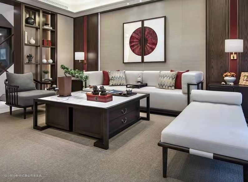 新中式风格的客厅家具在造型上选用一些栏栅,方圆结合等元素,让这个客厅充分体现了中国的美学精神。