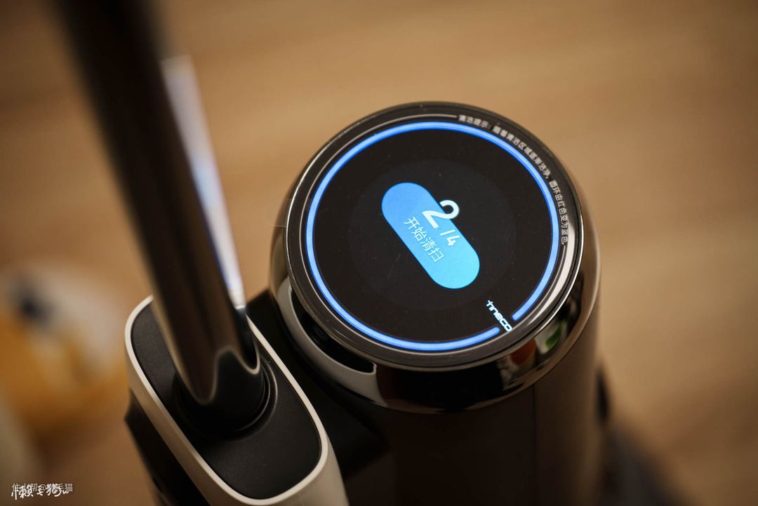 此外可以看到在处理污渍、水量较大的地面的时候,洗地机的洁净度提示圈会变红,随着洁净度的提升,会慢慢变回蓝色,也可以根据洁净度提示圈的颜色,决定到底要拖地几遍。