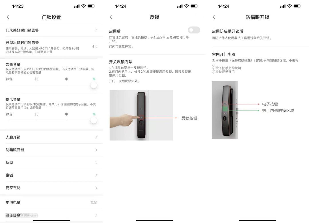关于门锁的功能性就介绍的差不多了。APP里还有很多关于门锁的设定以及说明,比如门未关时报警、多次错误密码报警、报警音量等,还有反锁功能开启选项以及防猫眼开锁说明等。