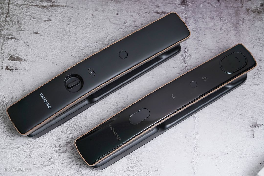 再来看看门锁的内外把手。上面的磨砂面是门锁内面板,下面的镜面是门锁外面板。其实老纪觉得门锁的外面板如果做成磨砂的不仅质感更好,也不会像老纪上一款门锁一样容易被粗糙的手指在密码区磨出痕迹来。