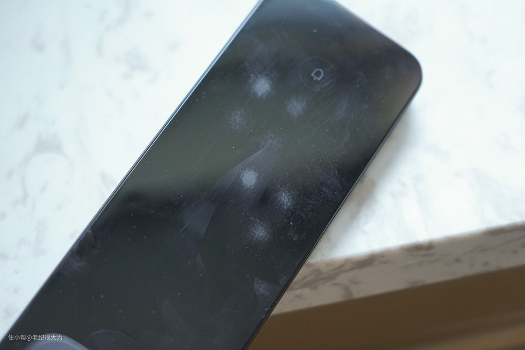 再看看老纪家原来的智能门锁。因为老纪的爸爸总是搬东西所以手指特别粗特别砂,每次回家都只能用密码开门,时间久了竟然在门上留下了非常明显的划痕。有心之人如果记录下对应的位置,还是很容易推测出密码的。因为之前楼道光线不好所以一直没注意,拆下来之后才发现划痕这么明显,看来密码还是不能常用。