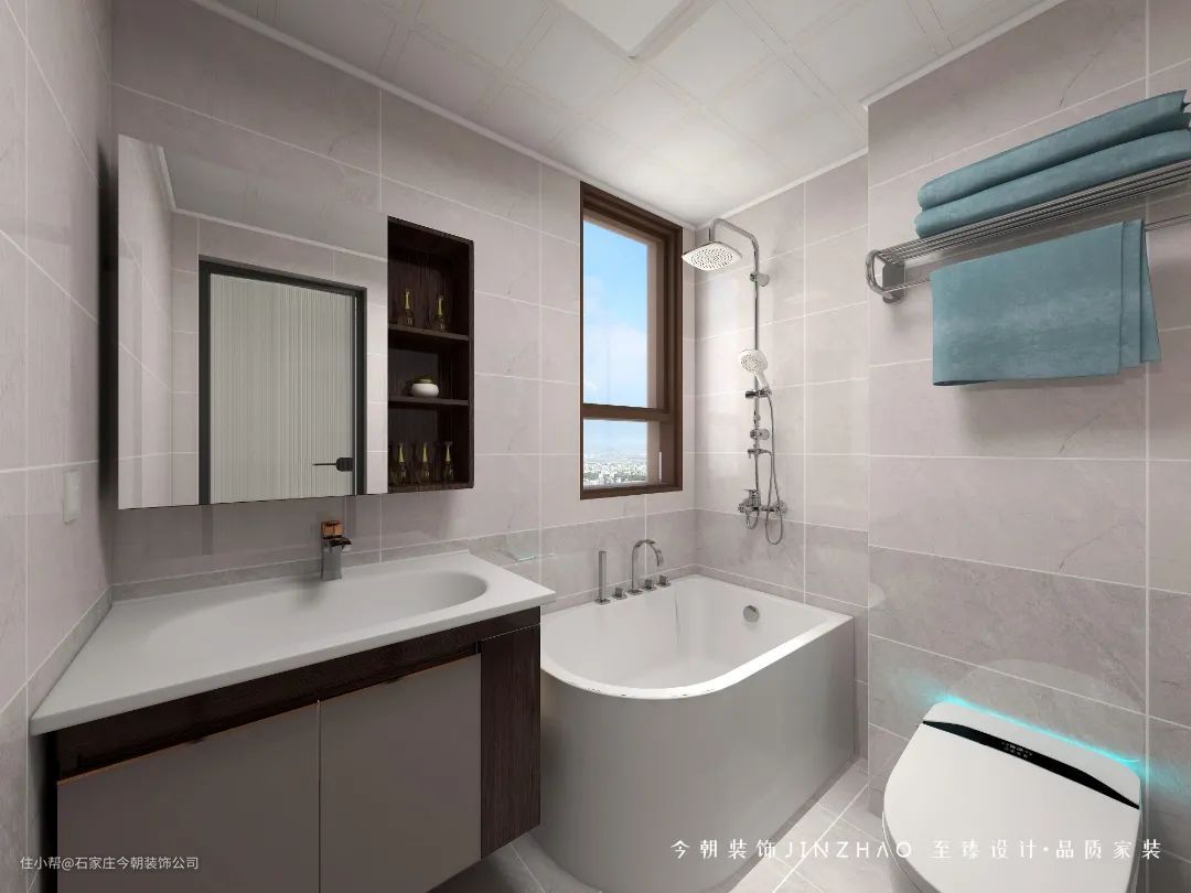 主卫定制了一个小小的浴缸,既可以淋浴也可以盆浴,整体灰色极简配色,简约时尚。