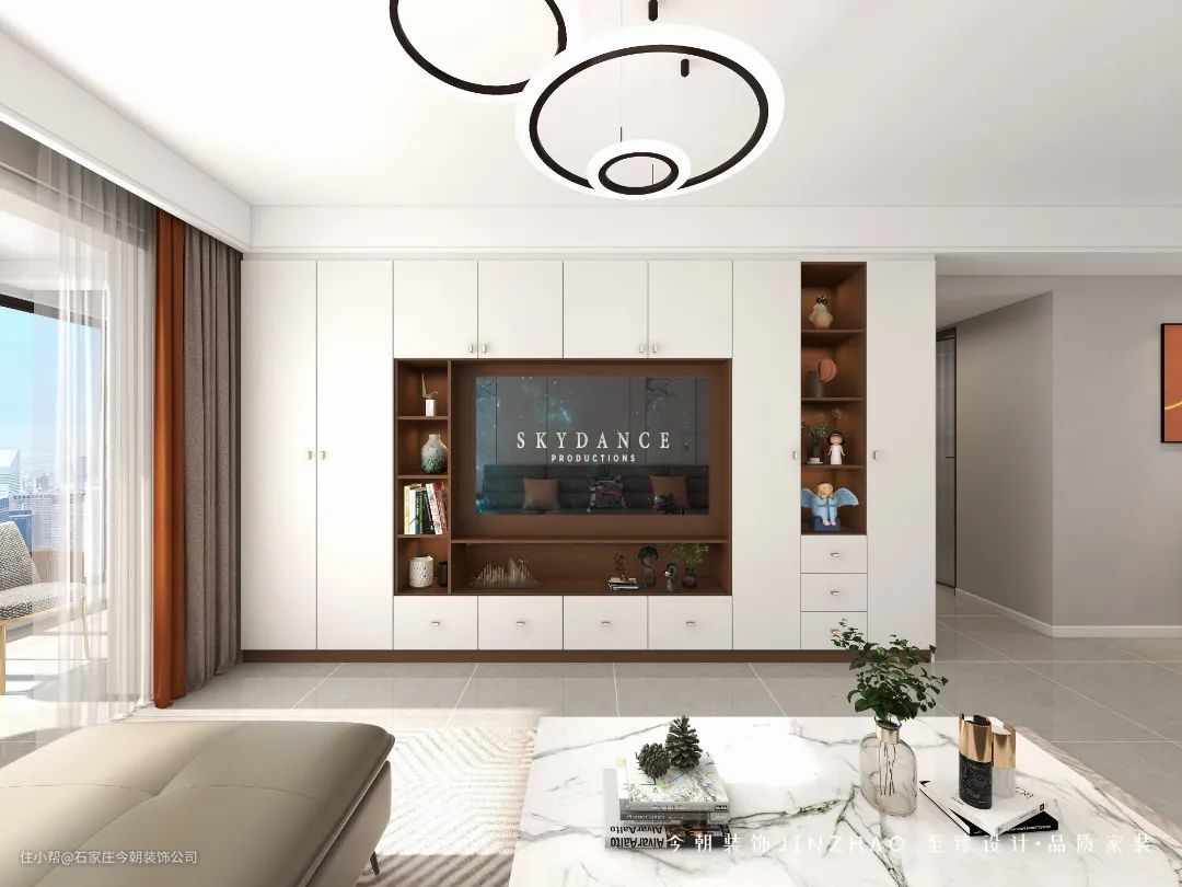 客厅以白色、深棕色为主,色调较为浅淡自然,加上通透的光线,整个空间还是比较明亮的。客厅电视墙,装了一整面储物柜,大大增强了居室收纳功能,居家生活,实用性很强。