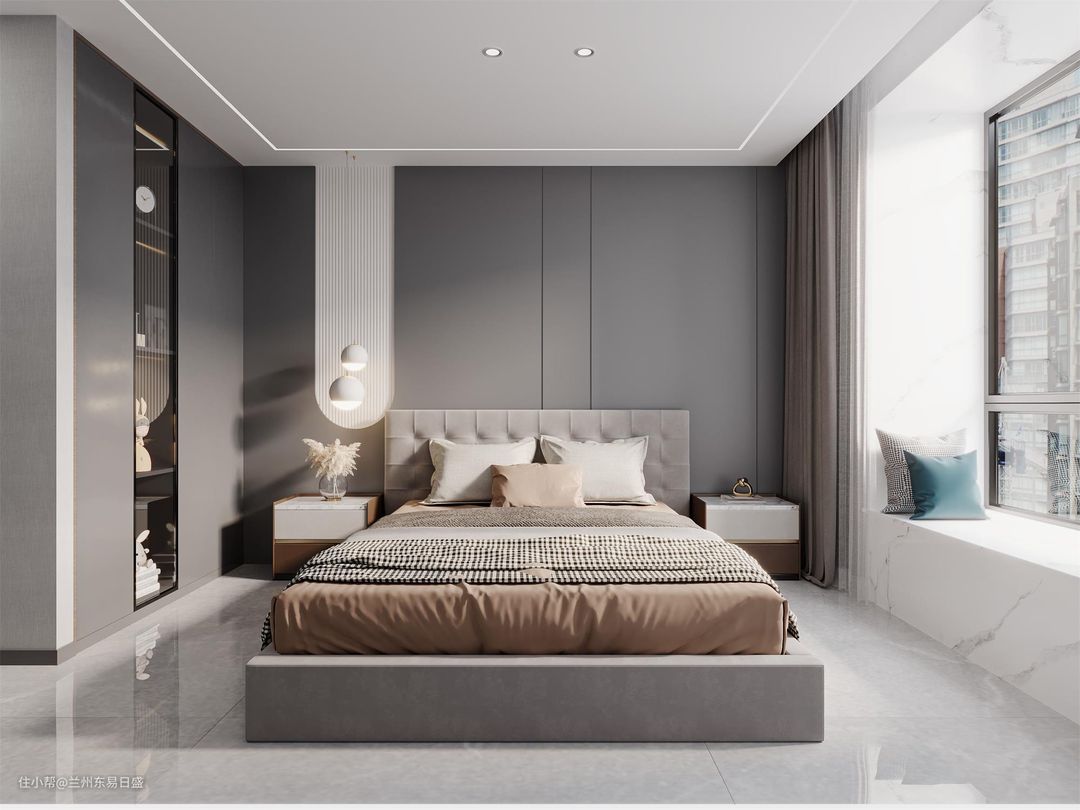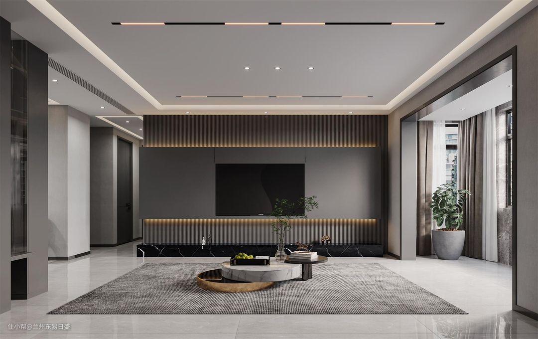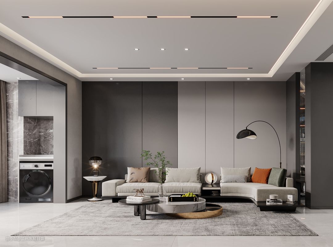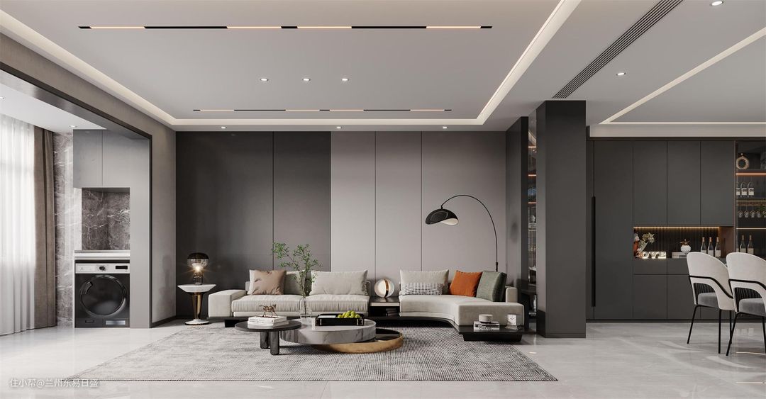 兰州碧桂园装修-现代简约风格-客厅装修效果图:客餐厅通铺灰色瓷砖,让整个空间变得更加宽敞舒适,无主灯设计独特有格调。