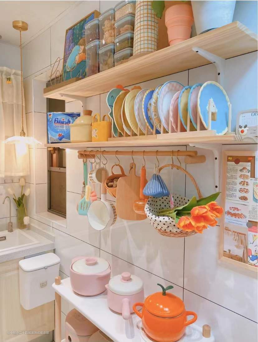 墙面不能做橱柜,但并不代表什么也不能做,如果你愿意多花一些心思,墙面可以加上小隔板,占用的空间不多,却能收纳很多的厨房小物件。