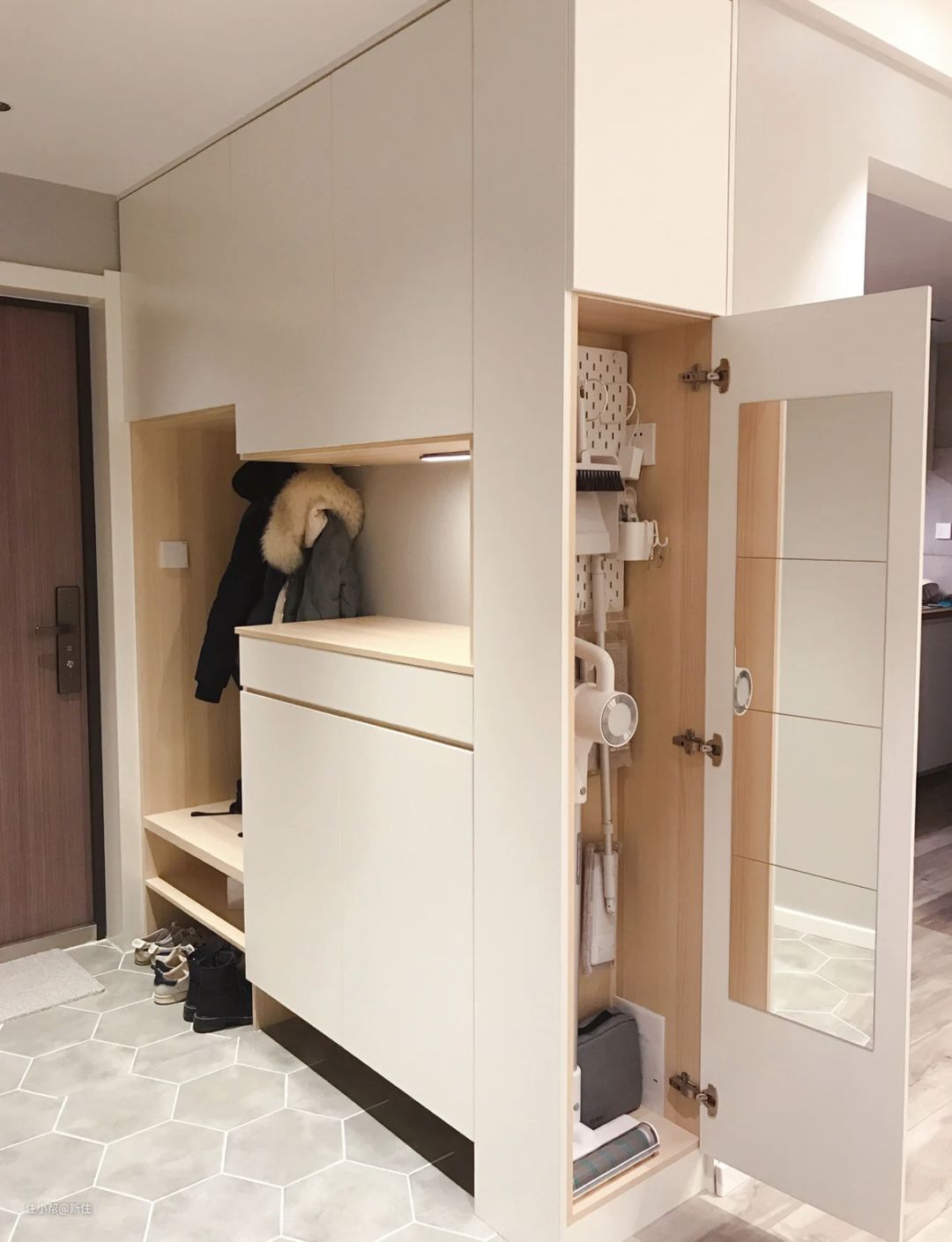 如果玄关柜空间允许,建议参考这个案例的做法,在侧边开个薄柜,25公分左右就够,里面固定个洞洞板,这样日常的清洁工具,扫地机、拖把等都能收纳进去,充当家政柜的功能。