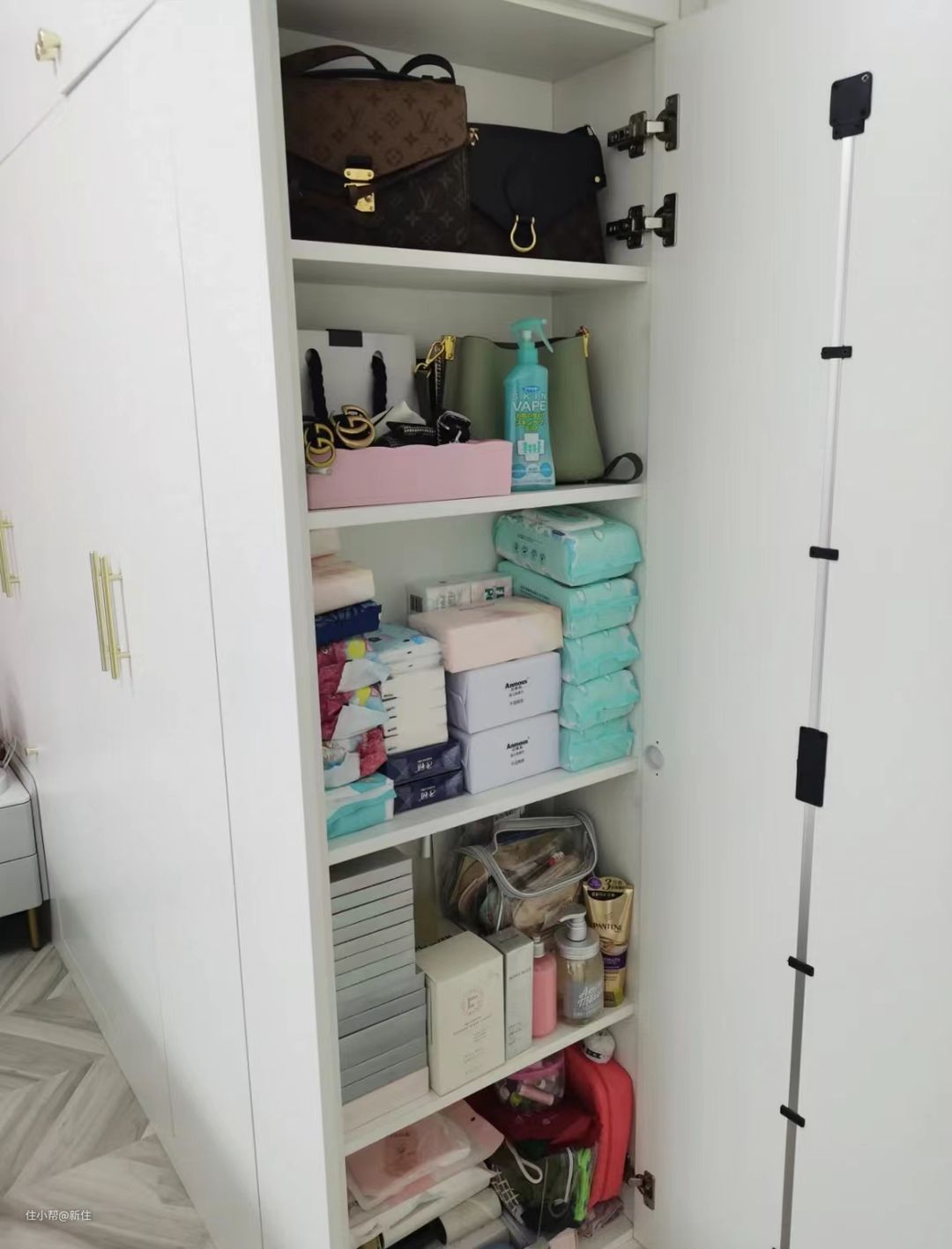 如果怕拿取不小心会撞倒旁边的,还可以在中下部分粘个伸缩杆,瓶瓶罐罐直接就被支棱起来了。