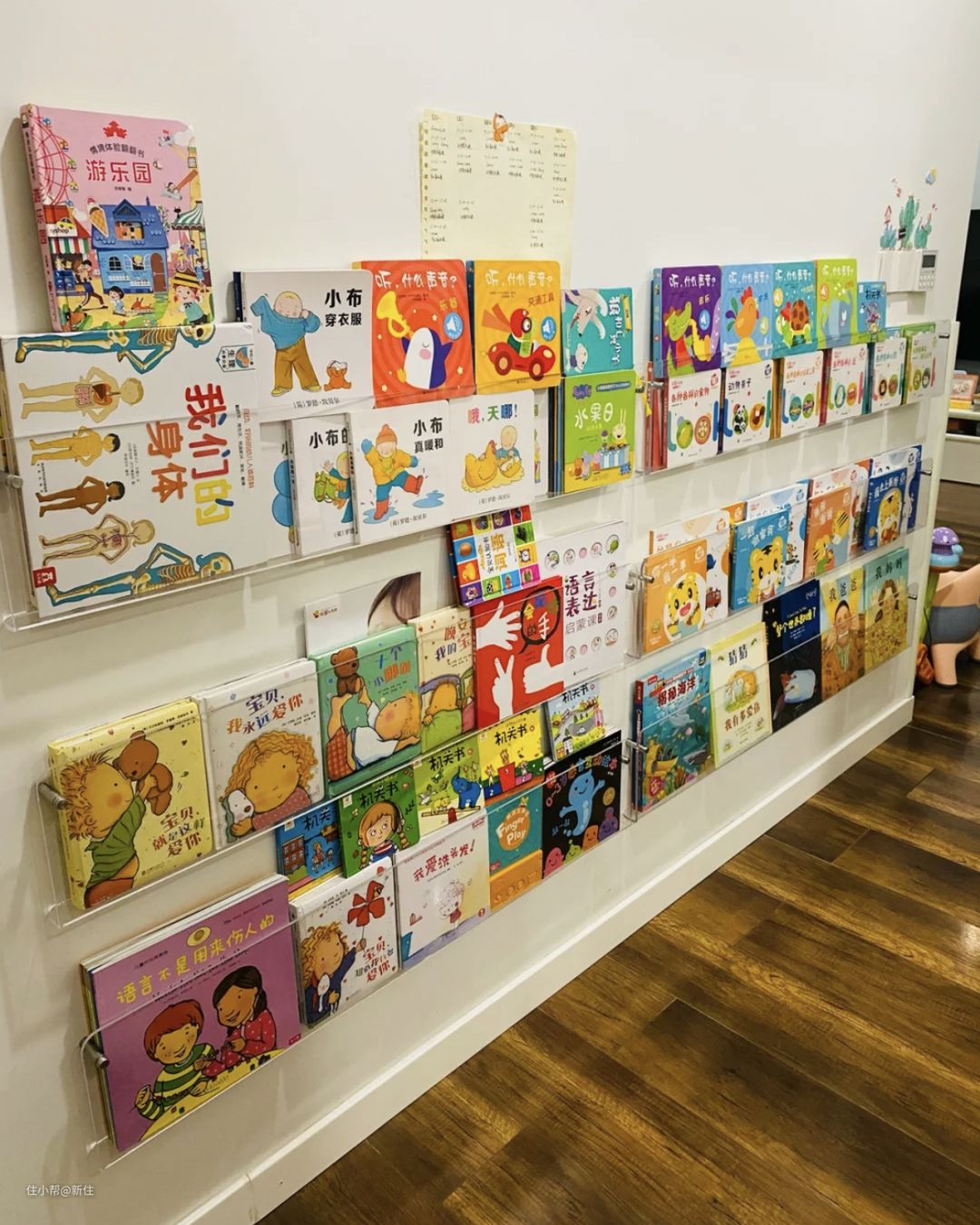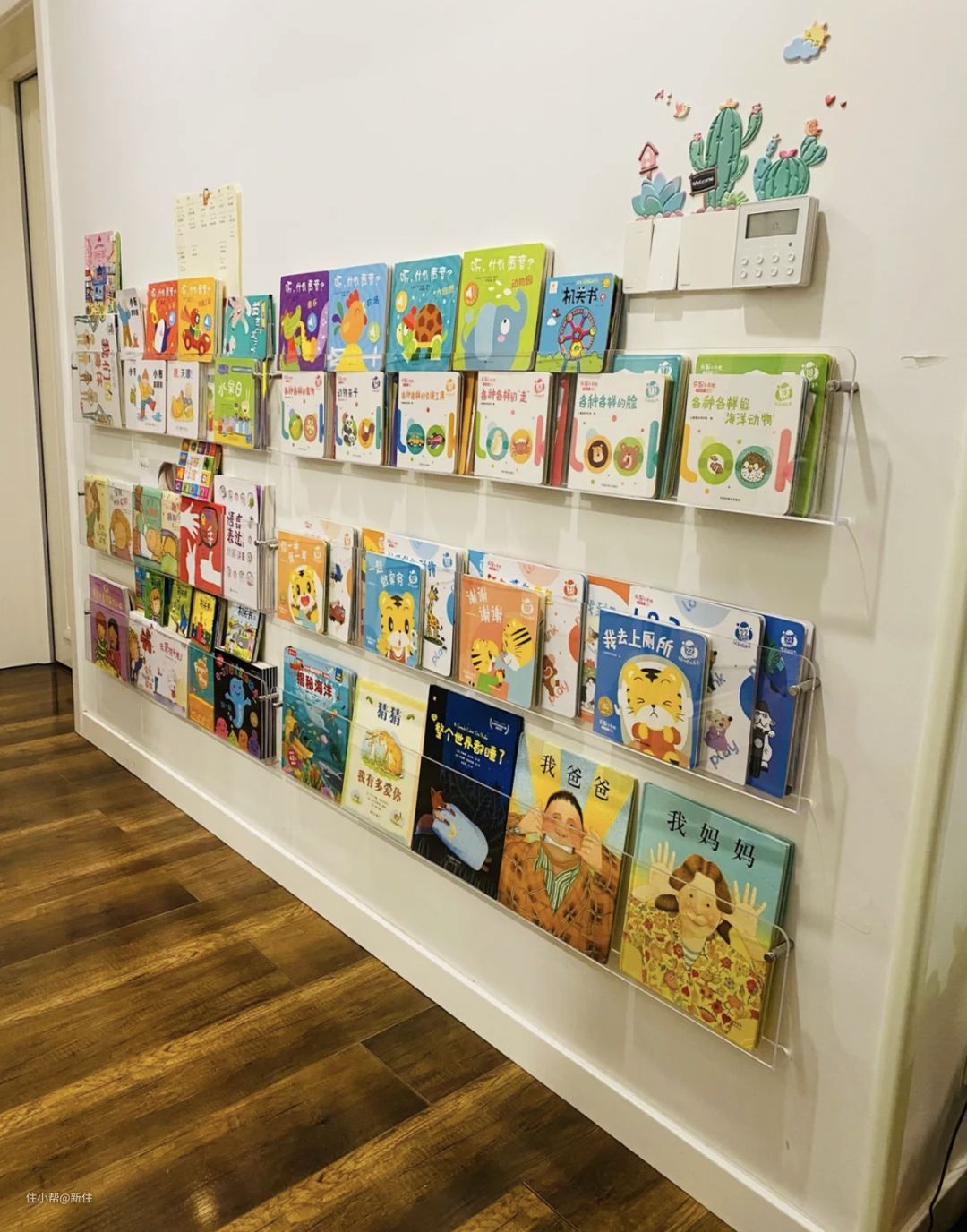 图中的是4cm的,因为屋主想着这里主要是展示作用,只放新绘本或者孩子特别喜欢的,其他的看过的书都会放在书柜里,所以足够用了。