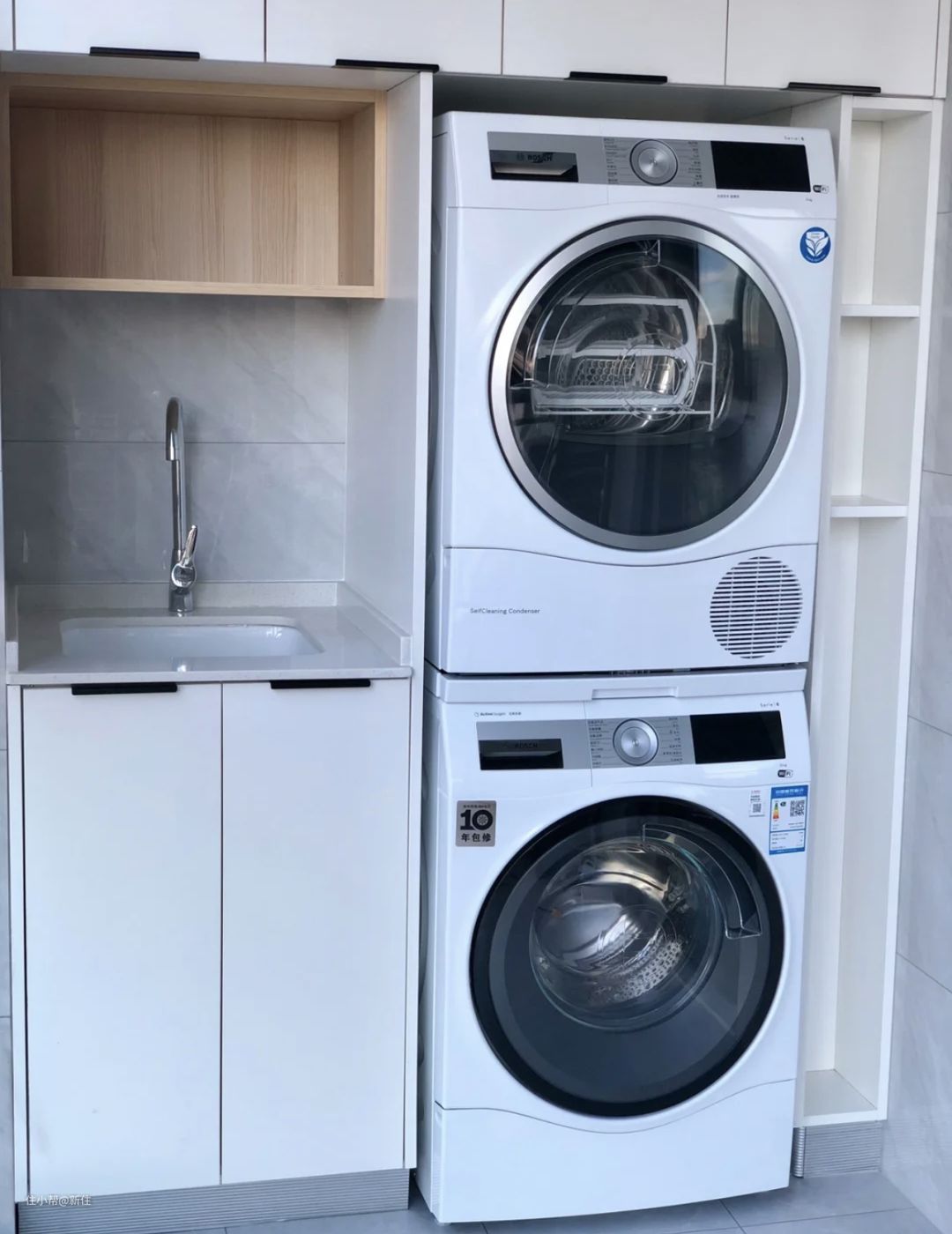 只要洗衣机在阳台的,大都会设计洗衣柜,并将尺寸卡的严丝合缝的。