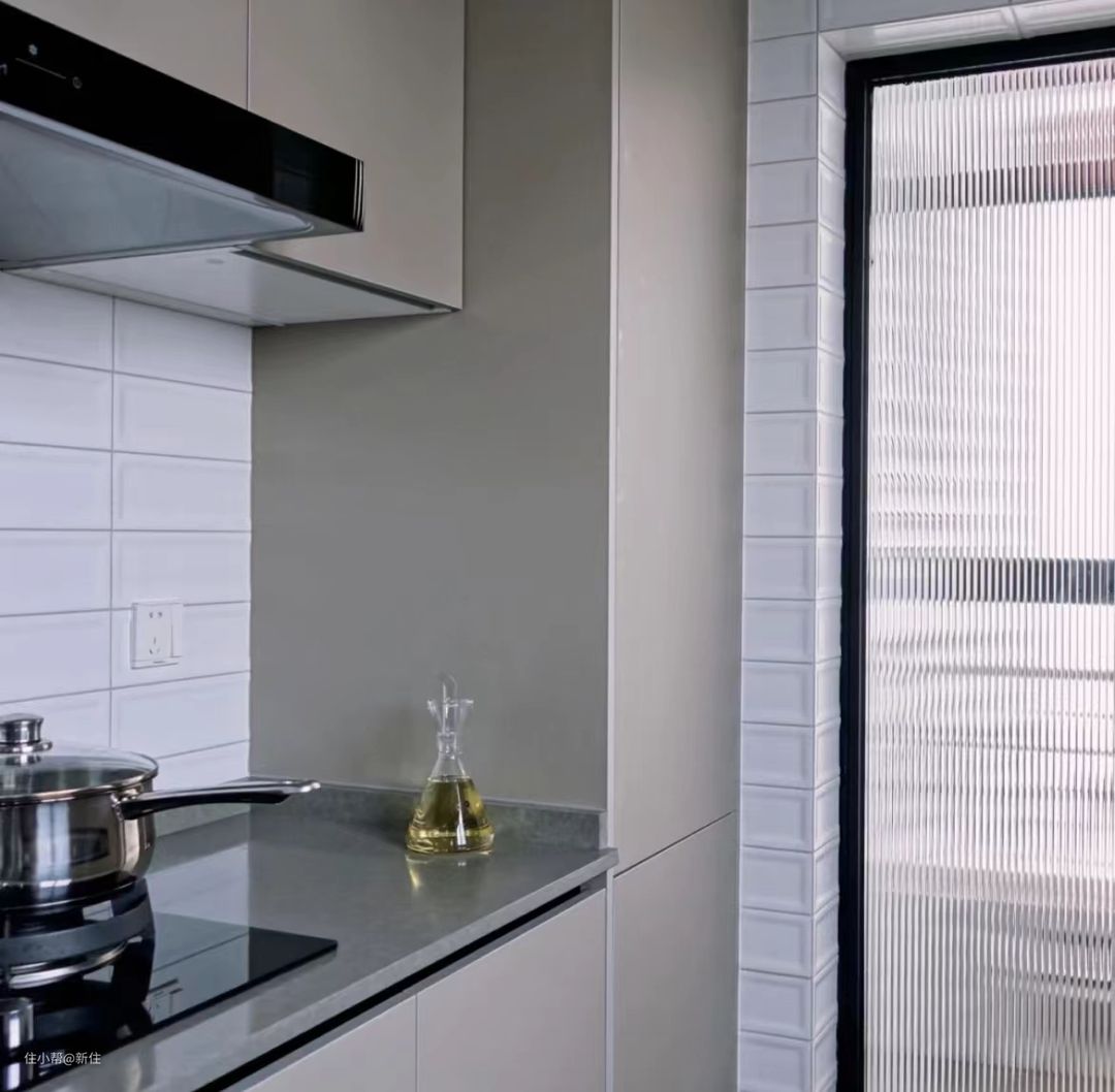 但其实,另外一侧也完全可以利用起来,做个薄柜,根据具体尺寸25-35公分均可,这样上面能放小电器,下面的薄柜还能收纳调味品或厨房囤货。