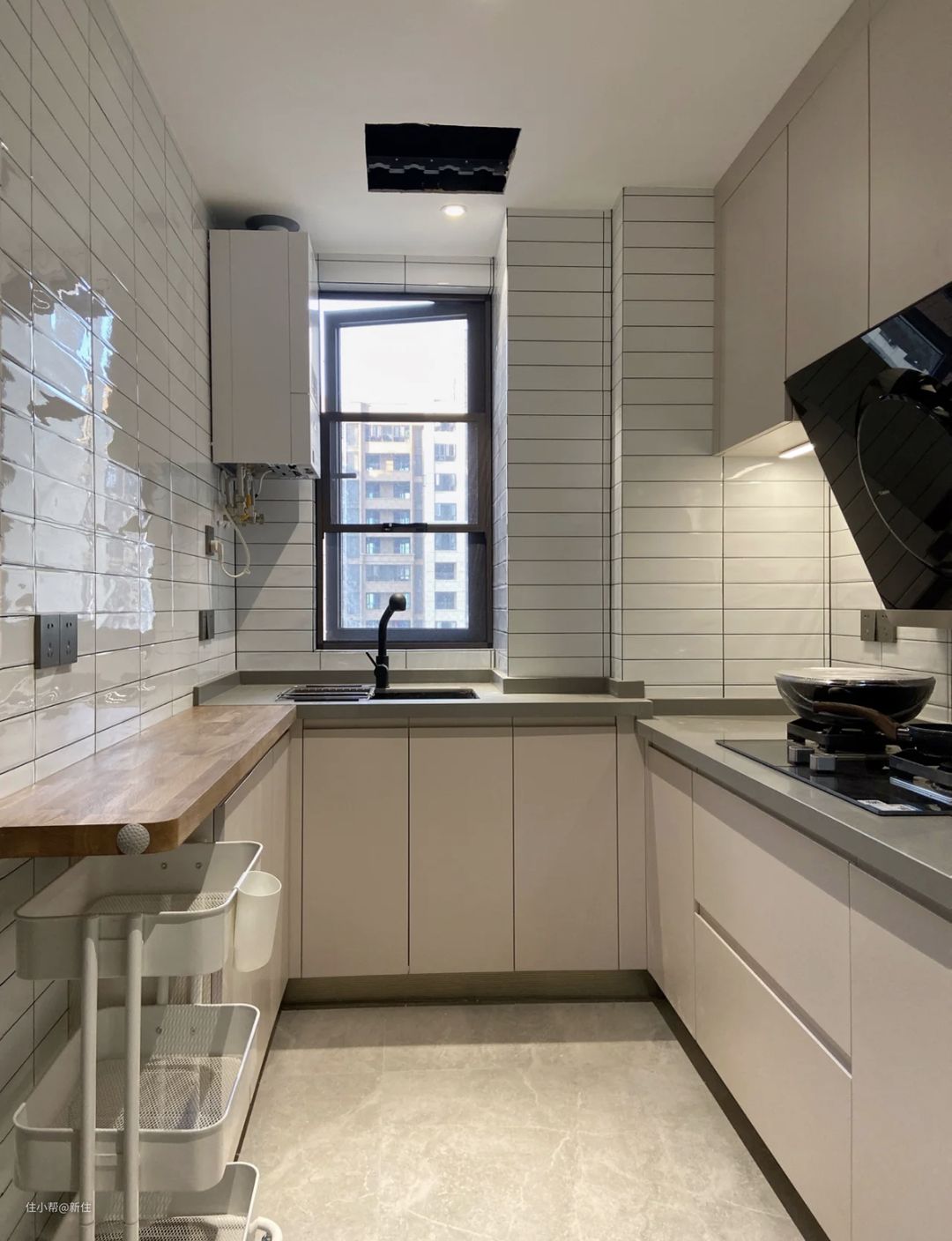 厨房一般都有个烟道,基本上的做法也都是瓷砖包起来,剩下的台面空间因为比较窄了,所以,很多人也不会想着它还能怎么用。