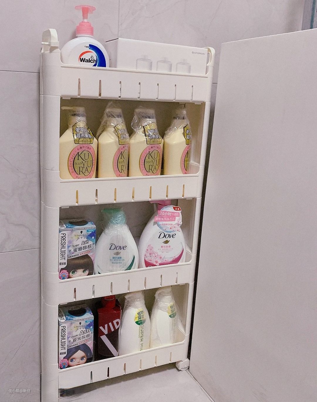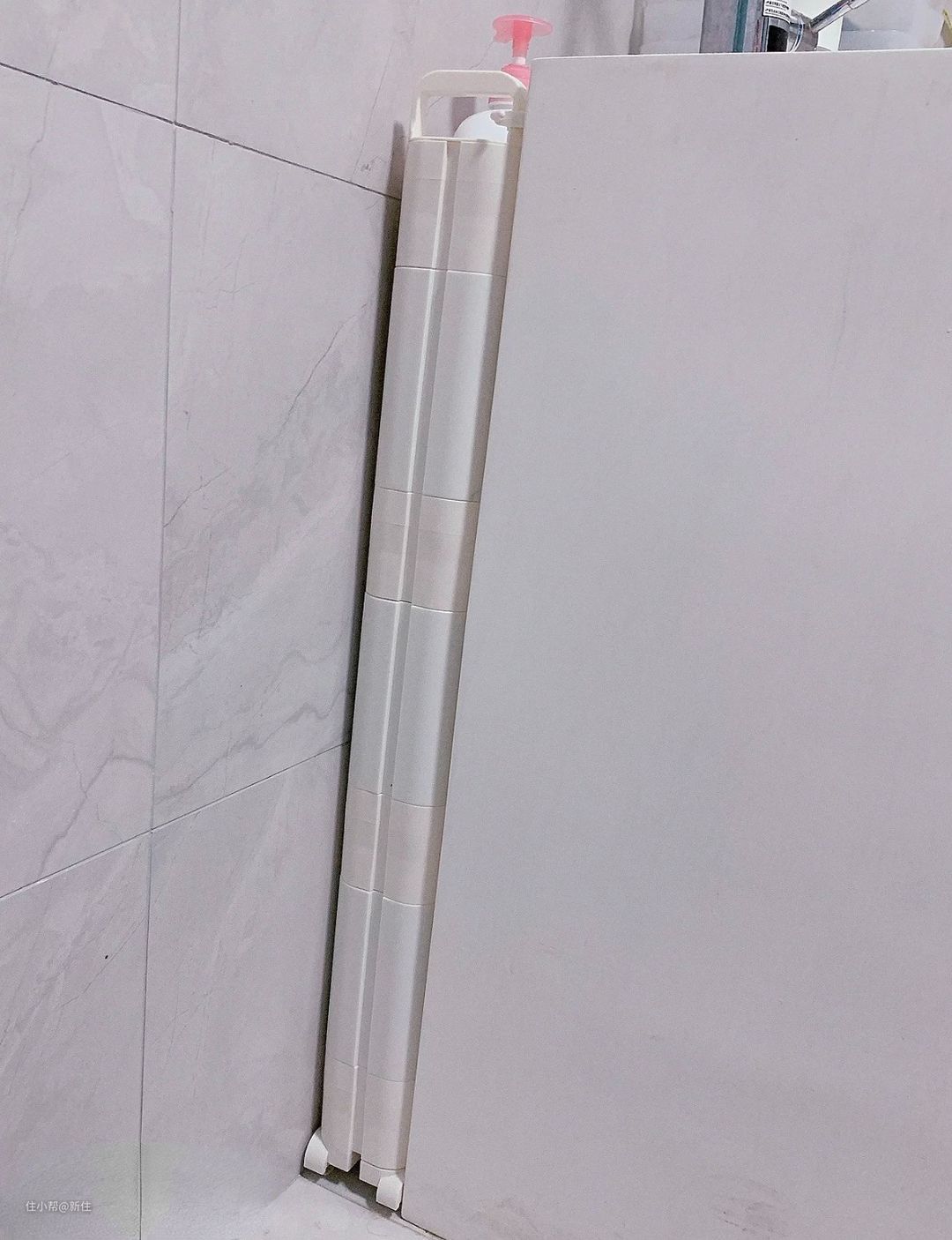 如果觉得定做柜子麻烦、代价高,也可以买个这种极窄的夹缝小推车,宽度16公分左右,高度50到100公分之间,根据自家的需求选择即可。