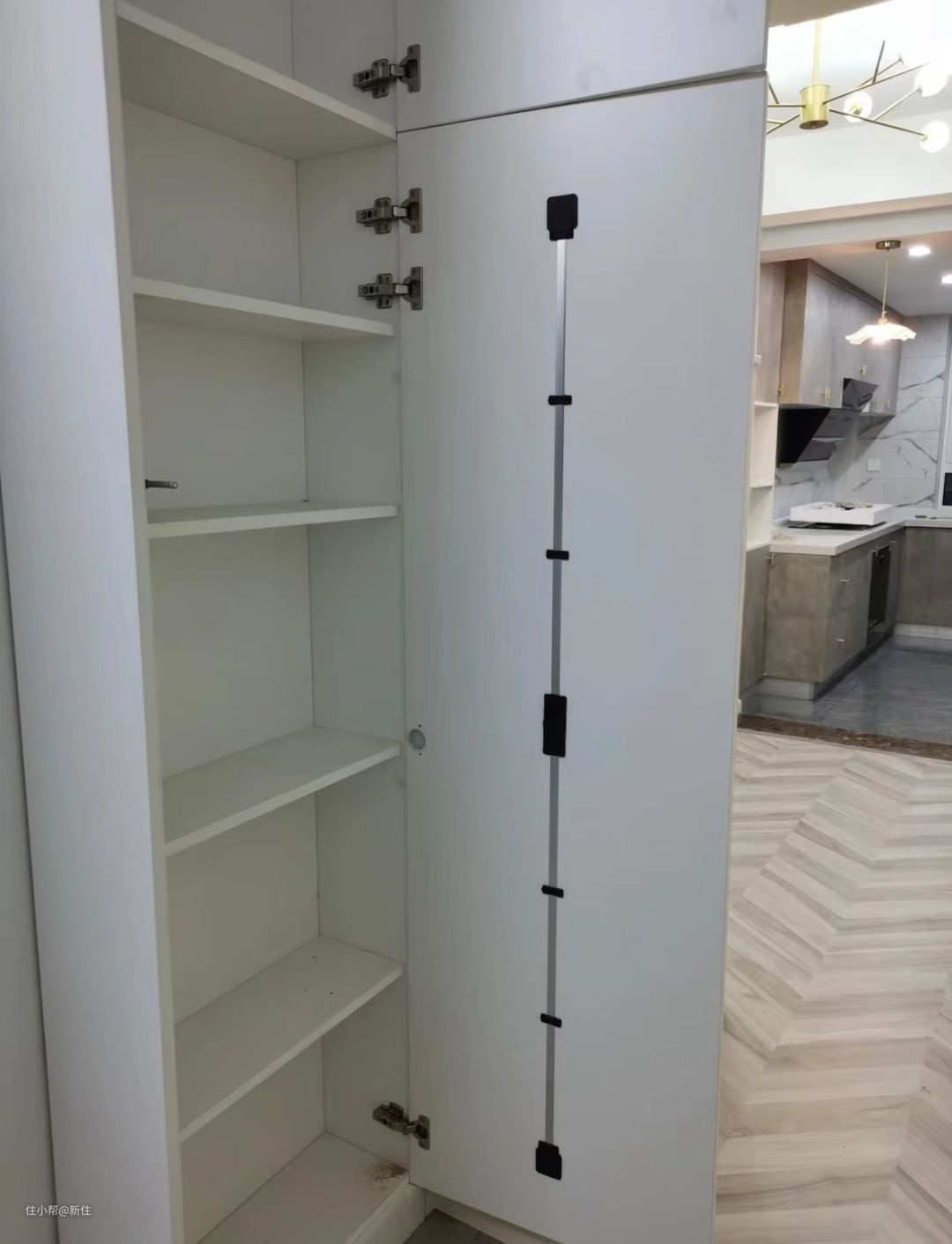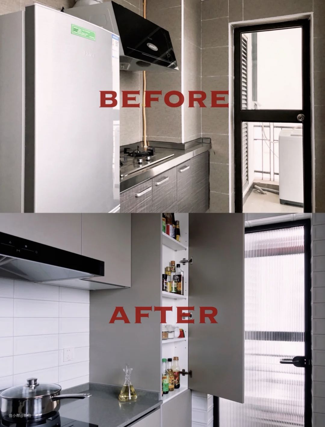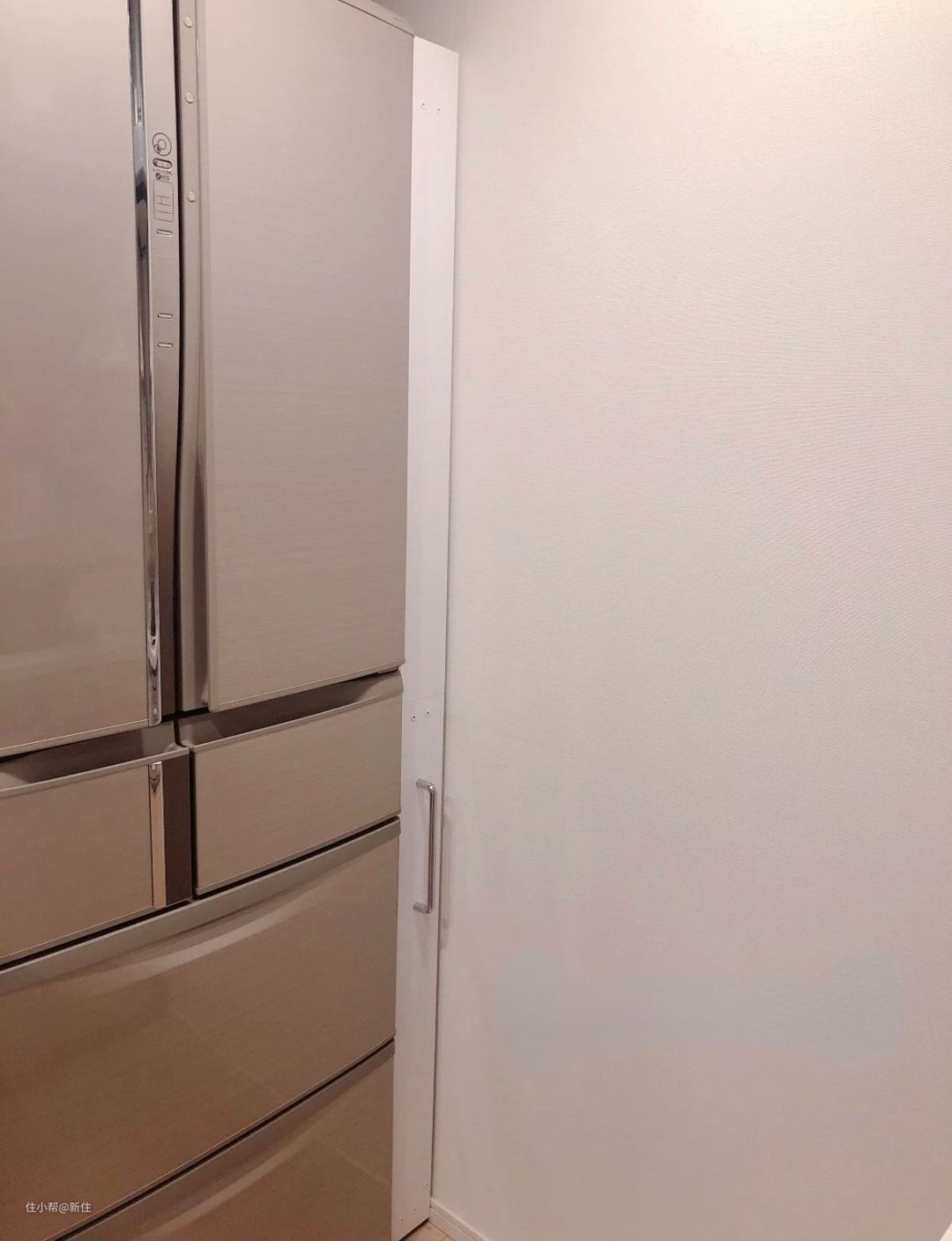 跟洗衣机柜一样,冰箱处因为尺寸没卡好,导致预留的空间宽出一截的情况,也大有人在,侧边的缝隙,同样有难看、藏污纳垢的问题。