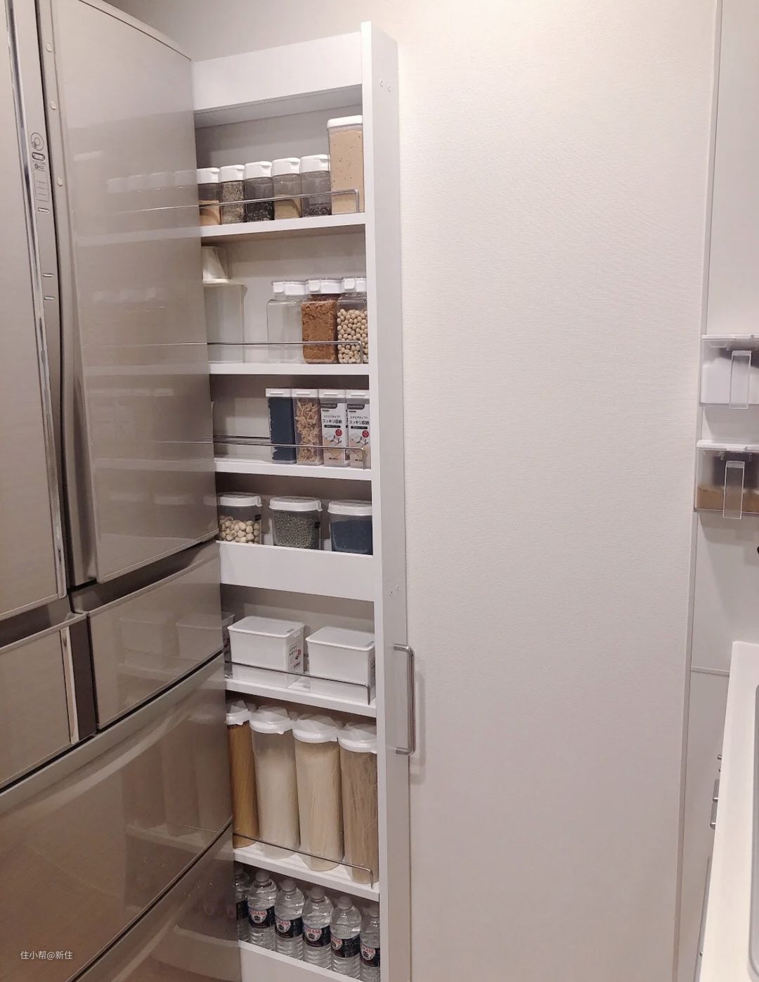 这种冰箱侧边薄柜,之前是只能定做,随着用的人多了,现在已经有了很多成品,按照尺寸买,直接放进去就能用。
