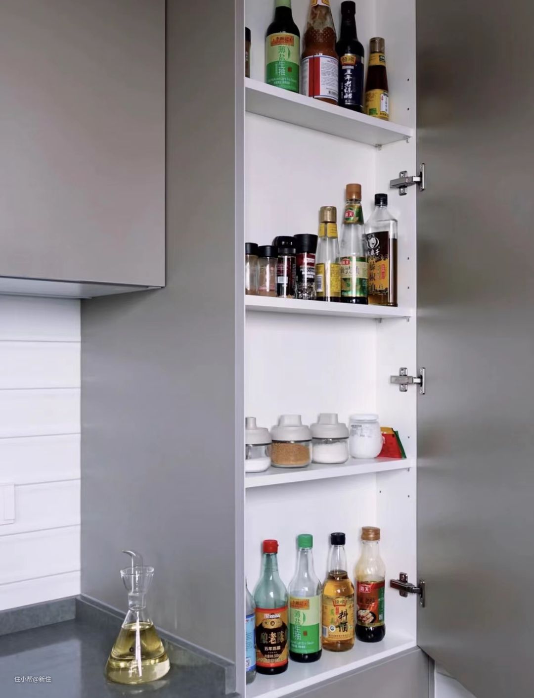 这样做饭时拿取调料也方便,且不用担心裸露在外,被油烟污染,好用度还是很高的。
