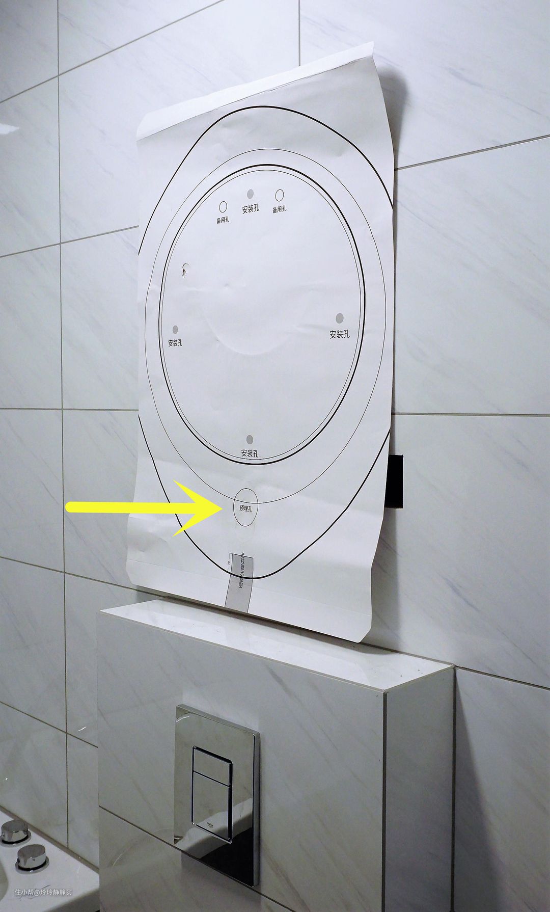 最开始装修时百废待兴,精力不够用,只想到了要在壁挂马桶上方的墙上安壁挂洗衣机,不知道买啥牌子,啥样的机器?也不懂可以预埋管的事,更没想美观的问题。初步计划进水共用智能马桶盖三通角阀,排水管直接插马桶里,按明线走法粗略定了电源插座的位置(黄色箭头给洗衣机留的电源线)。