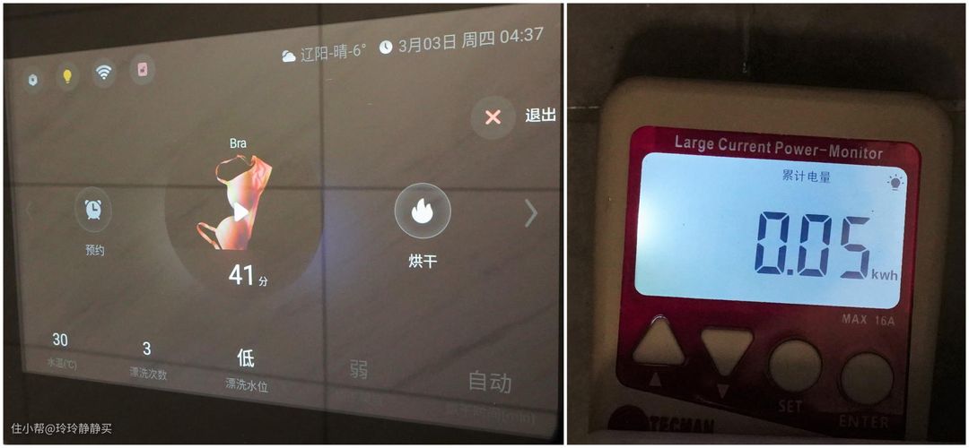 Bra专洗,30℃水温,低水位,漂洗3次,用时41分钟,耗电量0.05度。