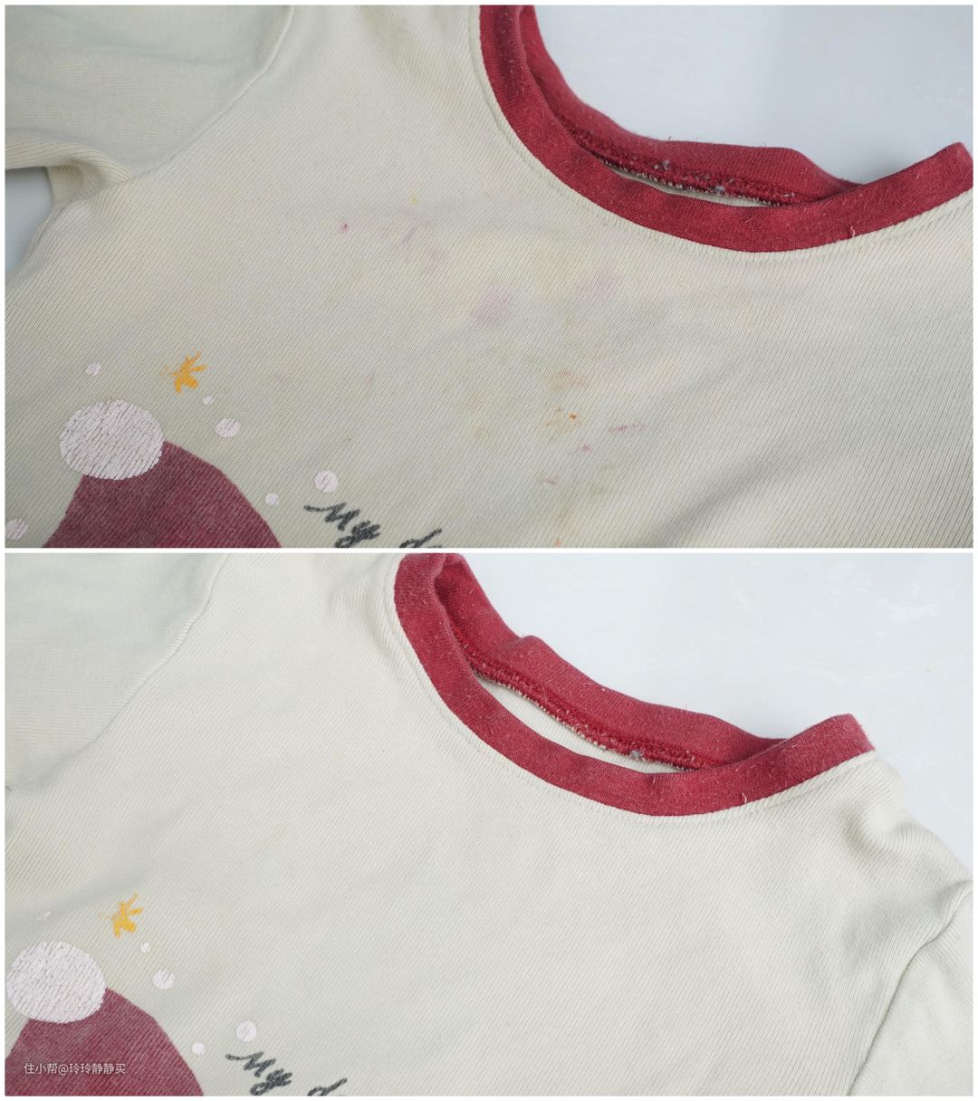 而母婴家庭常见的顽固污渍,如女儿衬衣胸口处蘸上的水果渍,已清洗多次,仍有痕迹。卫衣一天前蹭上的橙子汁,用小吉V5的婴童特渍程序洗,40℃水温,几乎都洗干净了,特别是衬衣上的顽渍,效果超过了我的预期。