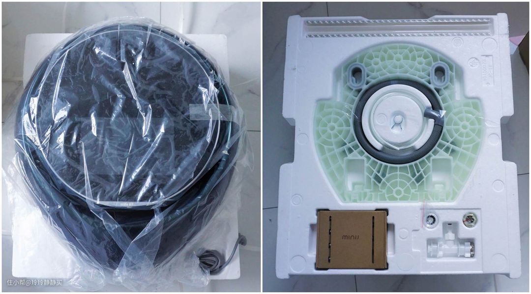 到货是一个扁箱子,正面是机身,泡沫底座后面嵌入式放着安装架、水管、进水三通、膨胀螺丝、走线槽等配件。