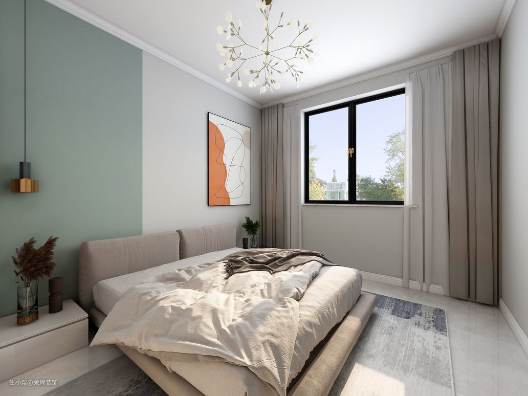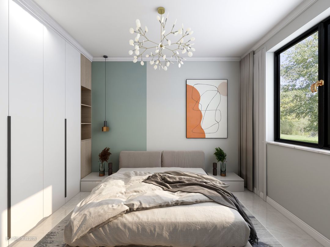 主卧背景墙做了拼色处理,墙上的艺术挂画,让空间更活跃。左侧的整体衣柜强化了主卧的收纳。