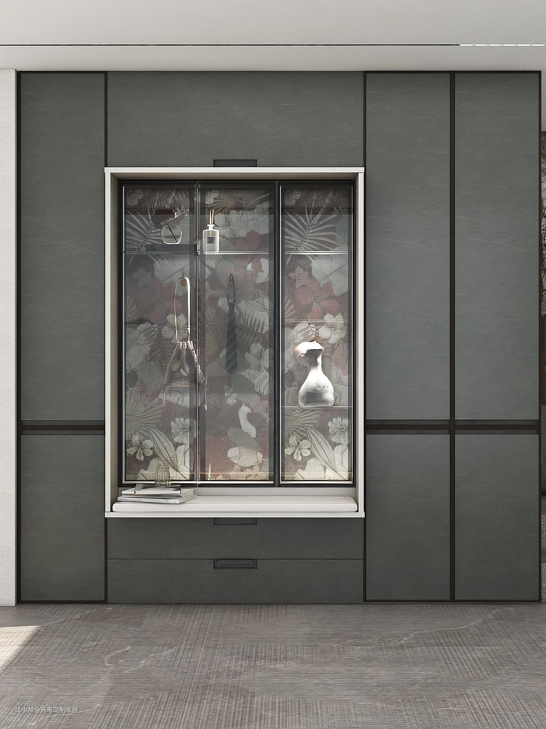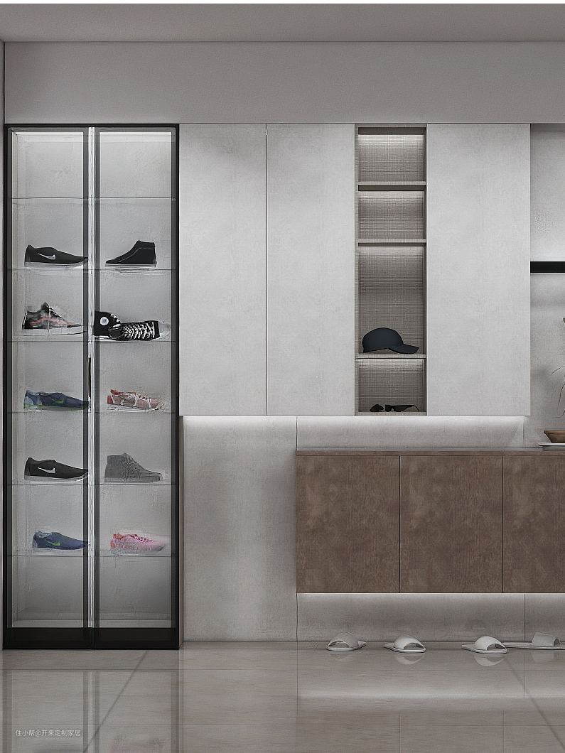 嵌入玻璃柜+花园背板打造视觉冲击,地柜+抽屉实现鞋袜收纳,卡座与吊柜丰富玄关功能层次。