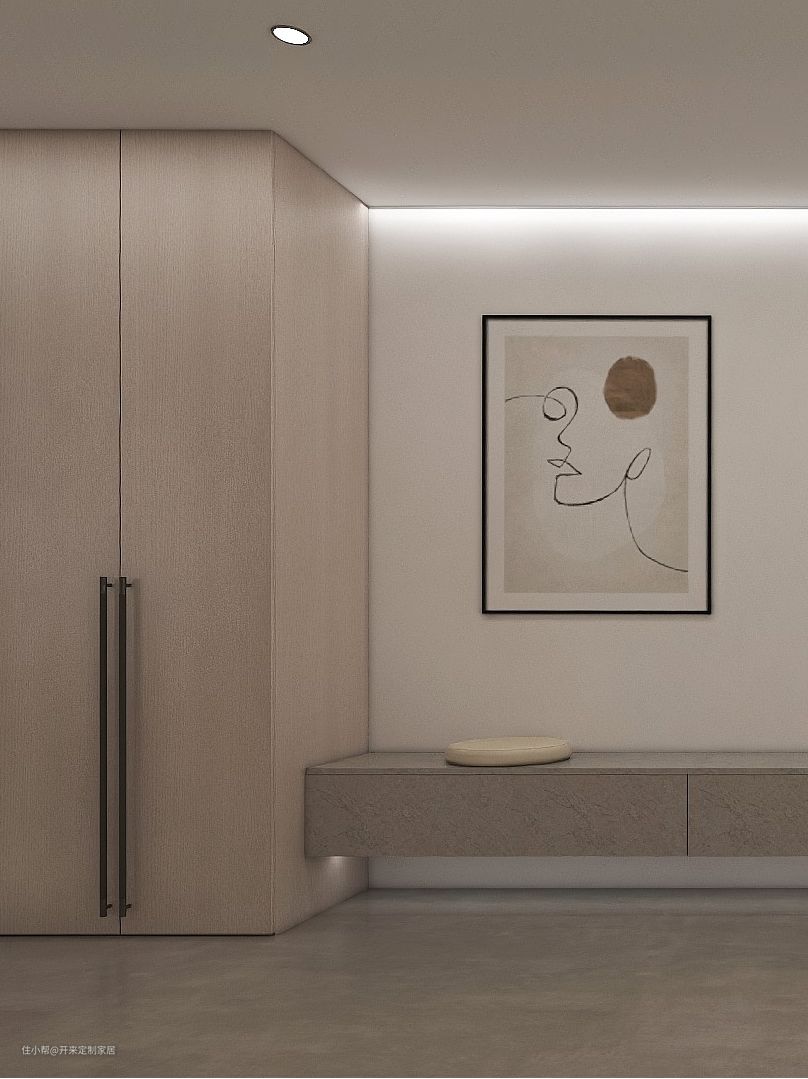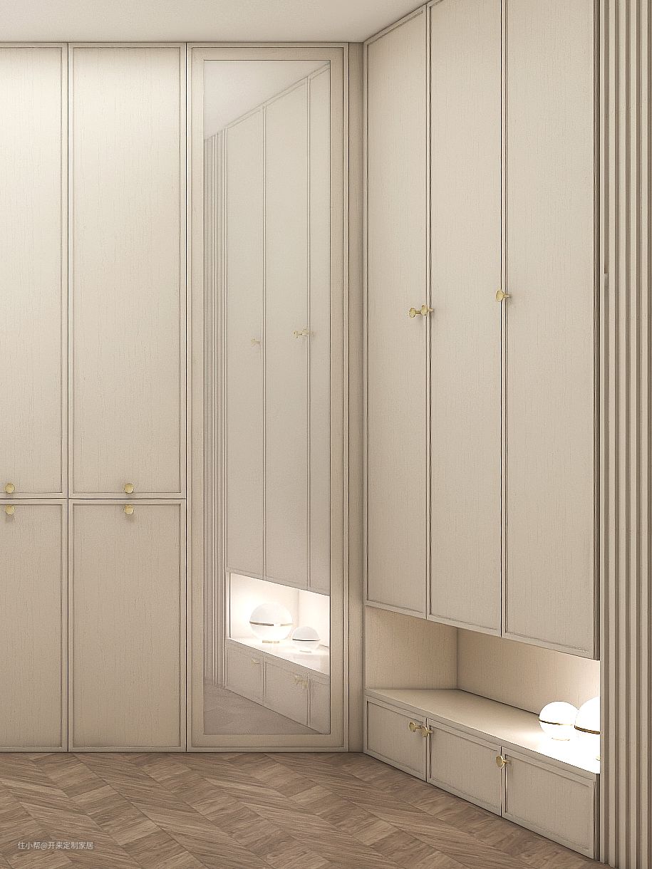 金色圆点拉手在极窄2cm边框门型中显得小巧精致,实木不厚重反而轻感十足、清新淡雅;地柜吊柜无缝连接而大气,搭配全身镜;吊柜与落地抽屉之间留空而出常位鞋区。