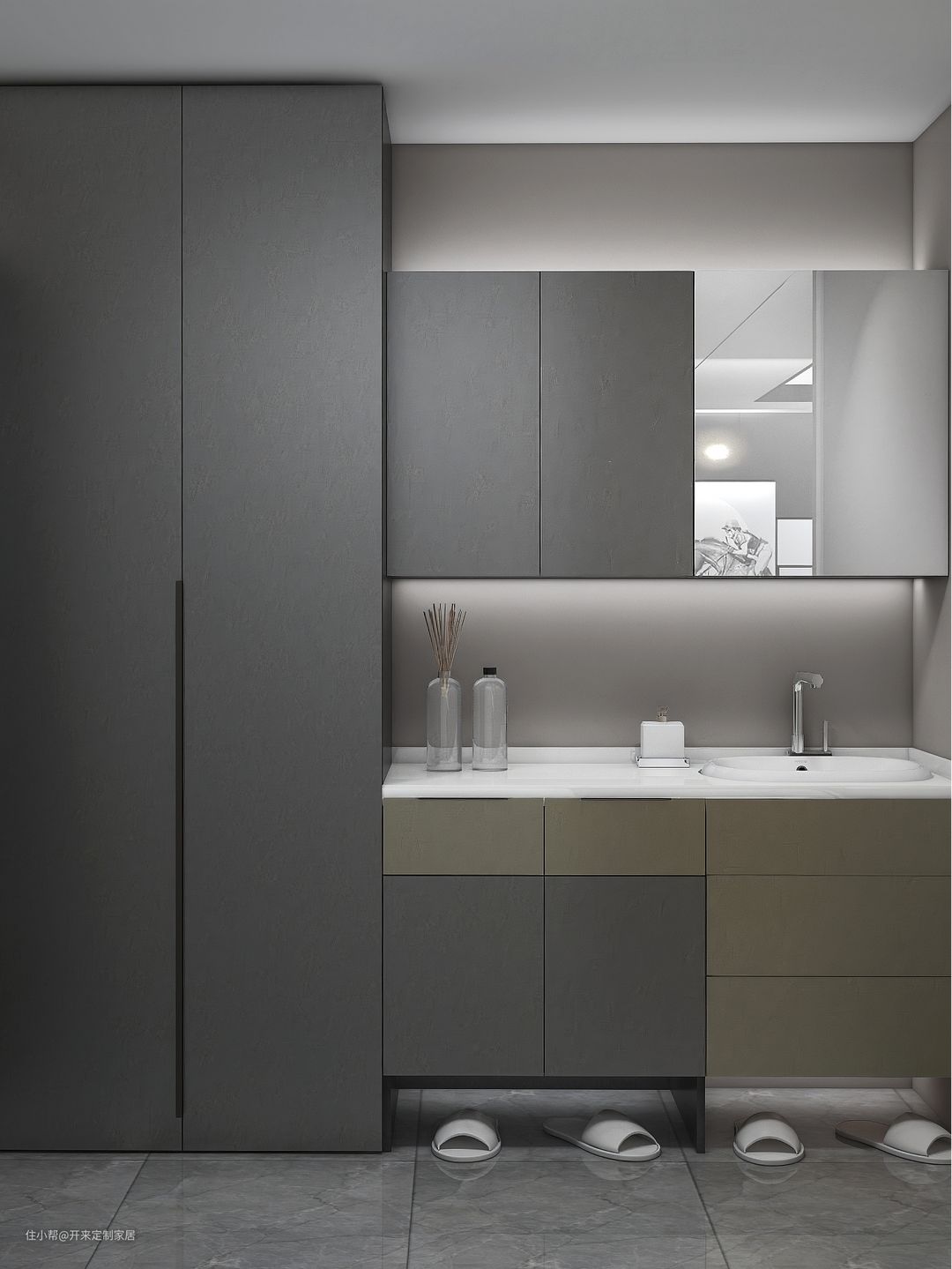 在玄关设计洗水池+镜柜,满足进出门洗用与整理妆容;抽屉储小物件+矮地柜储鞋+悬浮留空常位鞋+高柜实现绰绰有余的生活备用大收纳。