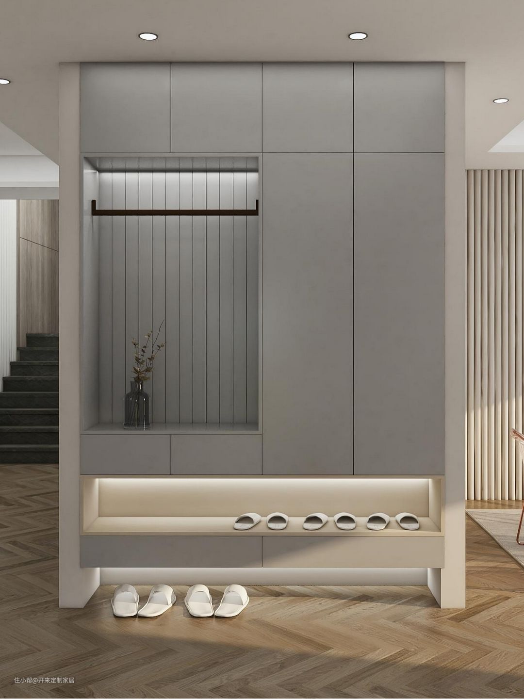 格栅装饰板+隔板开架+悬浮鞋柜,简约实用且装饰性强。