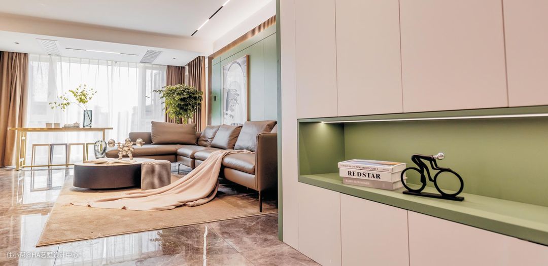 沙发背景设计师非常大胆的用了大片的绿,搭配沙发的质感,毛毯细腻的温暖,给人放松慵懒的舒适感。