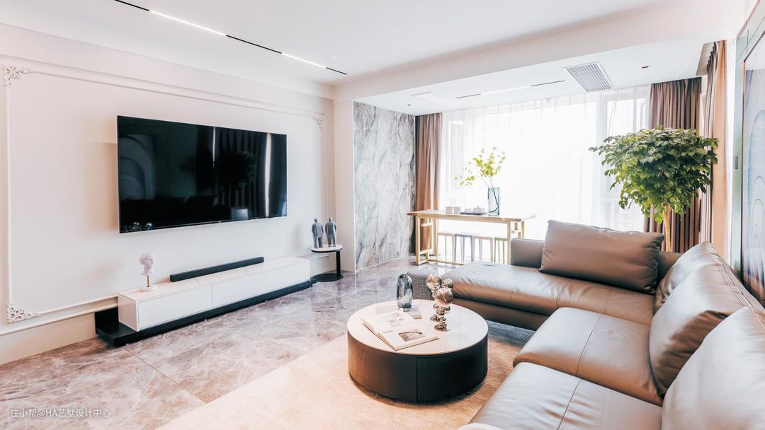 轻纱柔和了室外的强光,即保证了私 密性又使整个空间通透明亮而又神秘,一张极简的茶桌让业主度过一个惬意的午后。电视背景墙采用了 法式雕花,即有了法式的浪漫线条,也追求了现代简约的清新疗愈。