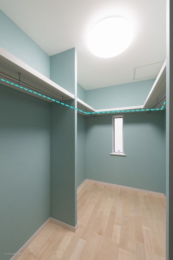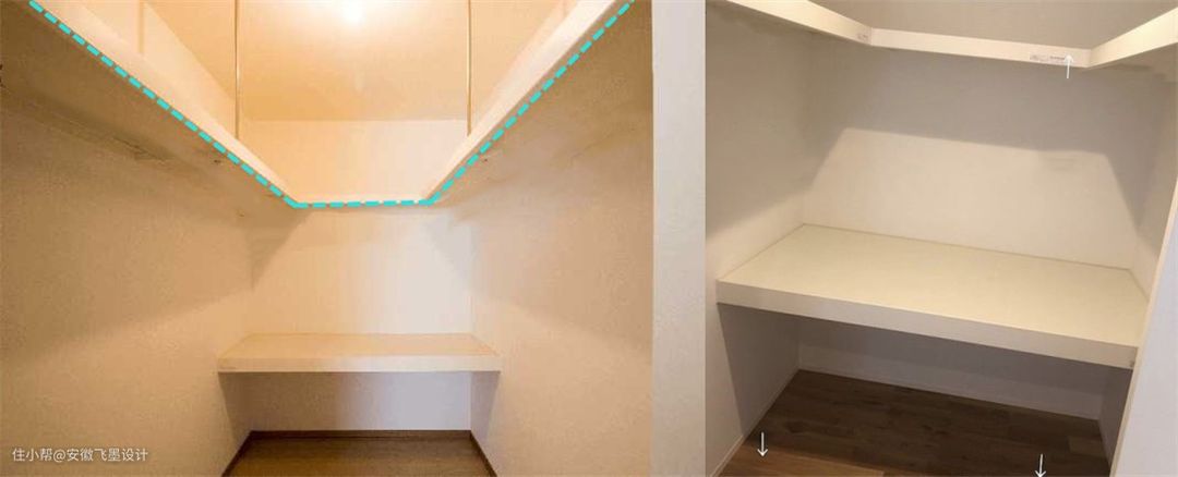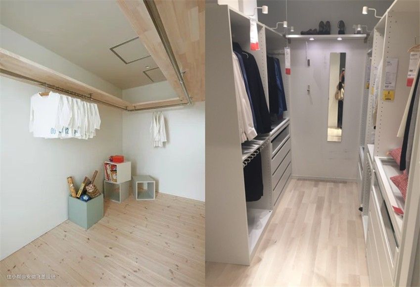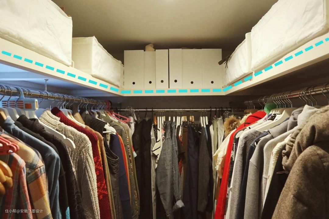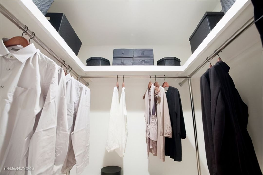 学他家,衣帽间里不打1个柜子,天花板下移30cm高围上一圈U型板,真正做到不占1㎡,收纳还多5㎡,省下不少打柜钱呢~