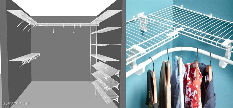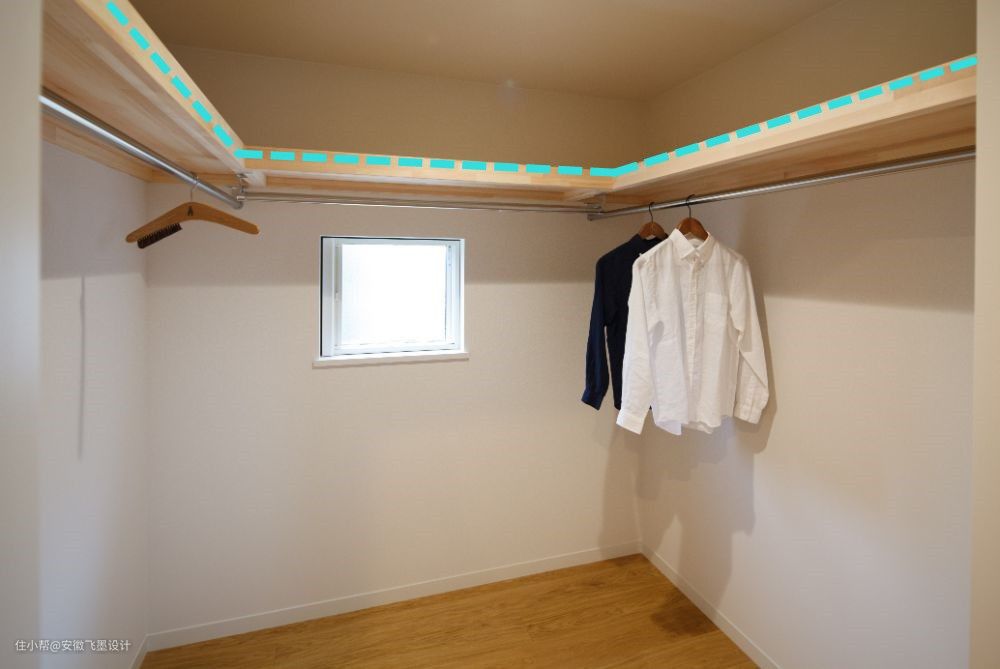 注意距离顶面天花板最好是30cm的距离,这样互不影响,让这U型板有足够的置物空间。另外这U型板的底下也可以花心思,底下可以安装一圈的挂衣杆,这样U型板上面用来置物,U型板下面用来挂衣,借助U型板实现上下分区收纳,让收纳效率妥妥提高2倍!