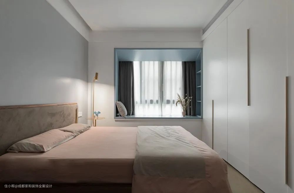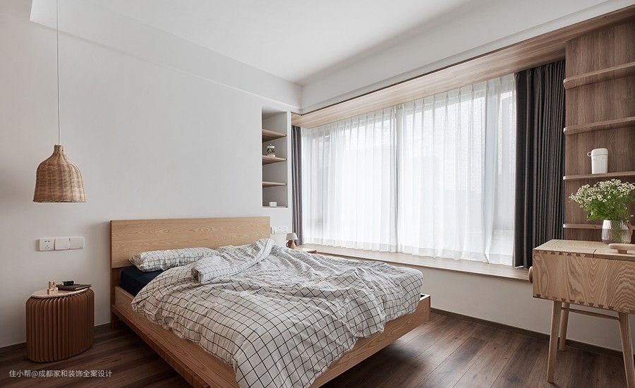 飘窗同样也可以按照这样的做法来设计,用木质材料将整个飘窗包起来,远看像一个“画框”,在窗边看着云舒云卷,心情都开阔不少。还可以结合同色系的储物柜设计,增加室内的收纳空间。