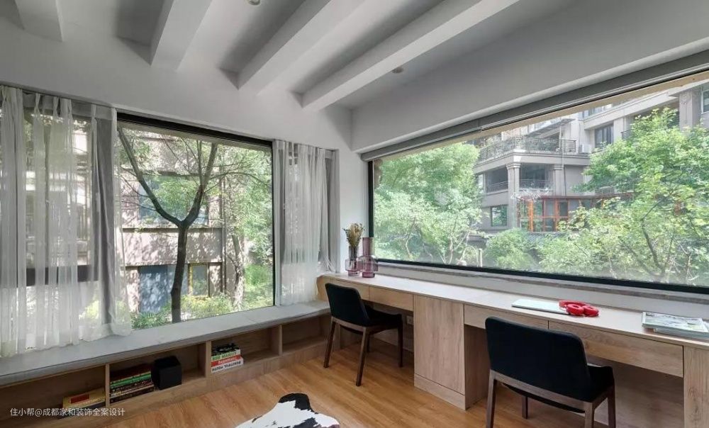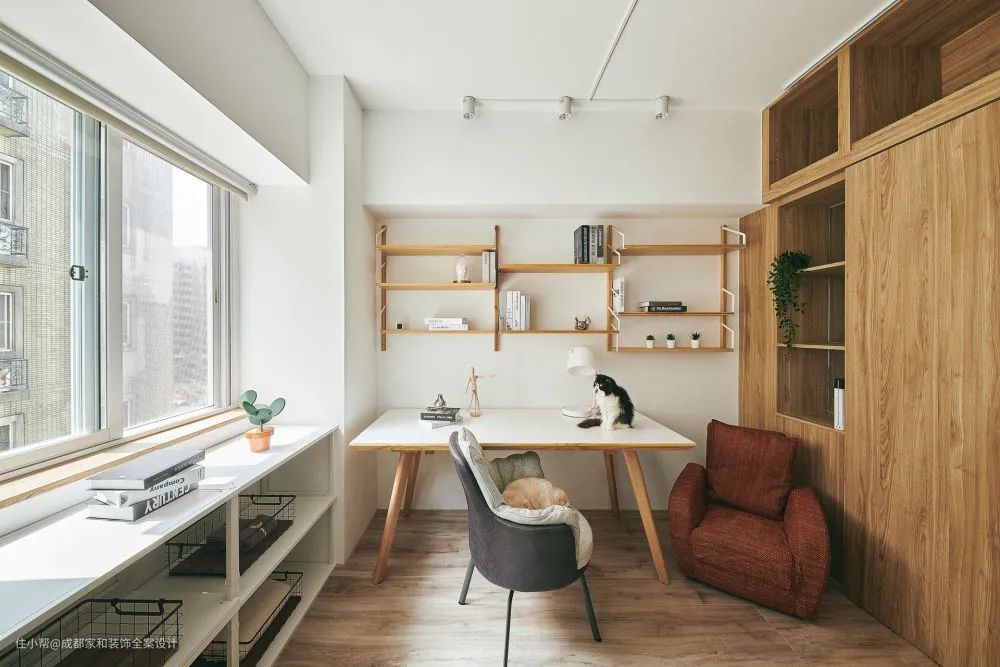 飘窗同样也可以按照这样的做法来设计,用木质材料将整个飘窗包起来,远看像一个“画框”,在窗边看着云舒云卷,心情都开阔不少。还可以结合同色系的储物柜设计,增加室内的收纳空间。