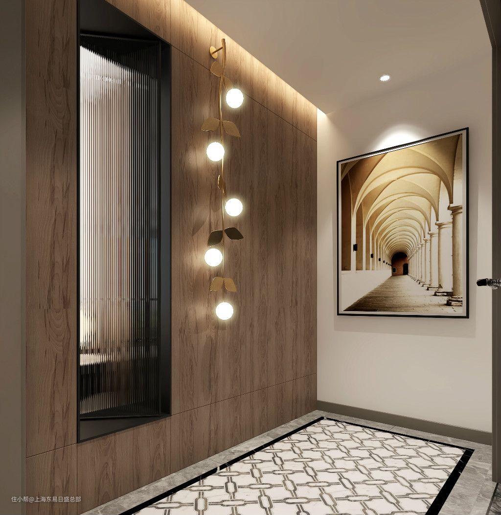 进门玄关处做了隐藏式柜体,通顶设计最大化利用垂面空间。木质柜体搭配旋转长虹玻璃装饰,让空间更加轻巧灵动。侧墙添加装饰挂画延展视觉空间,让原本狭小的门厅更有层次感。