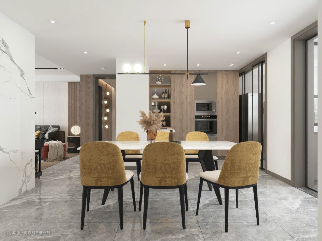 餐厅做开放式设计,轻薄的岩板茶几、明黄色的餐椅,营造温馨静谧的用餐环境。平面吊顶造型凸显舒适层高,搭配造型利落的吊灯,营造简约而不失质感的空间。