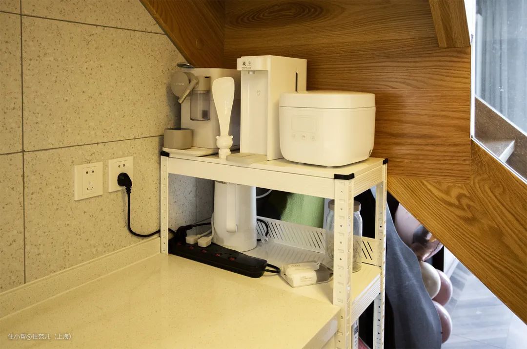厨房台面一直延伸到楼梯下面,这个位置很难再定制吊柜或者高柜了,于是用置物钢架打造了多层的小家电区。